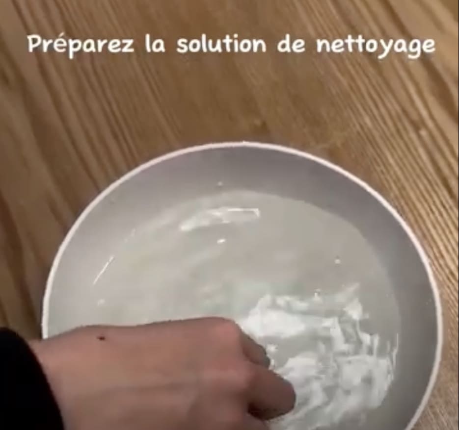 - Préparez la solution de nettoyage. Dans une bassine, mélangez de l’eau chaude avec une petite quantité de savon de Marseille. Vous obtiendrez ainsi un nettoyant doux mais efficace, sans l’agressivité des produits vendus dans le commerce.