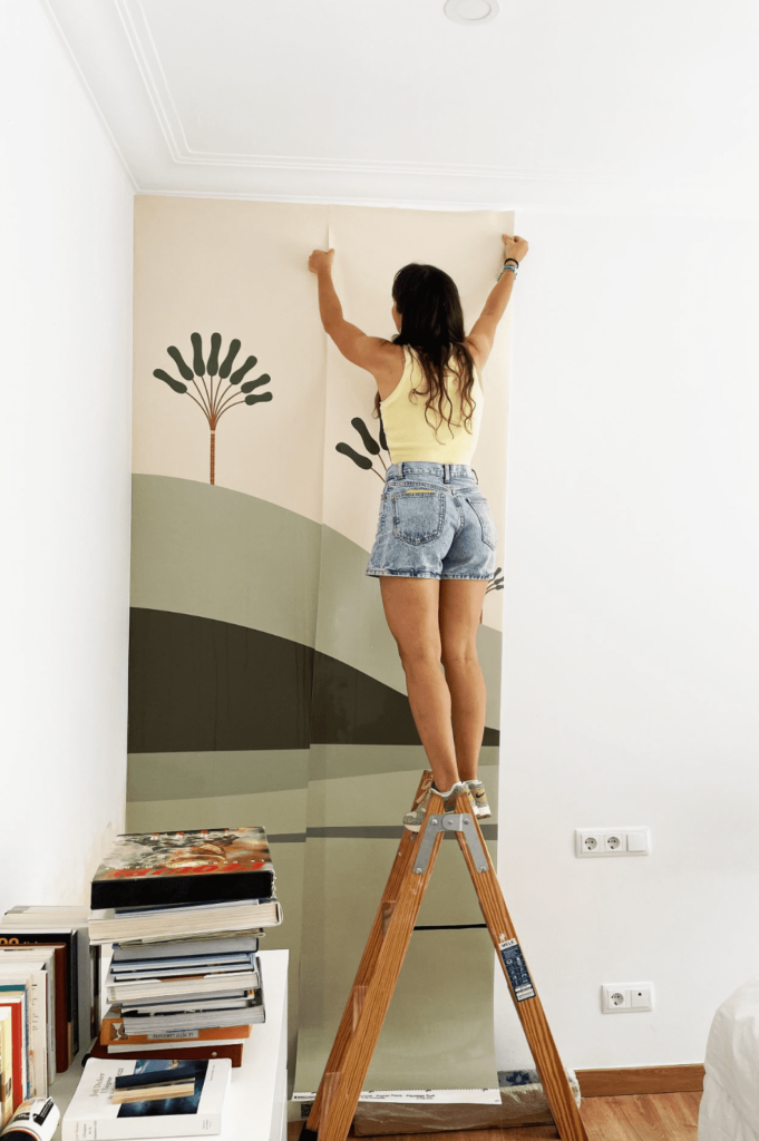 • Posez et alignez : commencez par le haut du mur en alignant le premier lé avec soin. Veillez à ce que le raccord des motifs soit parfait dès le départ. Utilisez une brosse à tapisser pour lisser le papier peint et éliminer les bulles d’air, en partant du centre vers les bords.