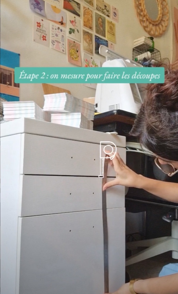 Maintenant que nos meubles sont parfaitement poncés et prêts pour leur métamorphose, il est temps de prendre quelques mesures. Armé de votre mètre ruban, c’est le moment de jouer les architectes d’intérieur. Cette étape vous permet de vous assurer que le papier peint adhésif s’adapte comme une seconde peau à son nouveau support. Mesurez avec précision la hauteur, la largeur, les recoins et les bords de votre meuble. Chaque centimètre compte ! Notre petit conseil : ajoutez quelques centimètres supplémentaires aux dimensions relevées pour vous laisser une marge de manœuvre lors de l’application.