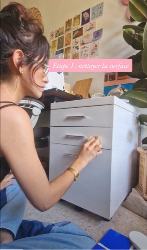 Première étape de notre aventure DIY : préparons nos meubles à recevoir un tout nouveau look. Vous avez opté pour des papiers peints encollés traditionnels ? Il y a un petit travail de préparation à faire : le ponçage et le nettoyage. Que votre meuble soit en bois ou en plastique, un bon ponçage permet d’obtenir la surface parfaite pour que la colle adhère au mieux. Cette étape n’est par contre pas nécessaire pour les papiers peints adhésifs, qui peuvent être appliqués directement, mais elle est importante pour garantir la longévité et la propreté de votre projet DIY avec des matériaux plus traditionnels.