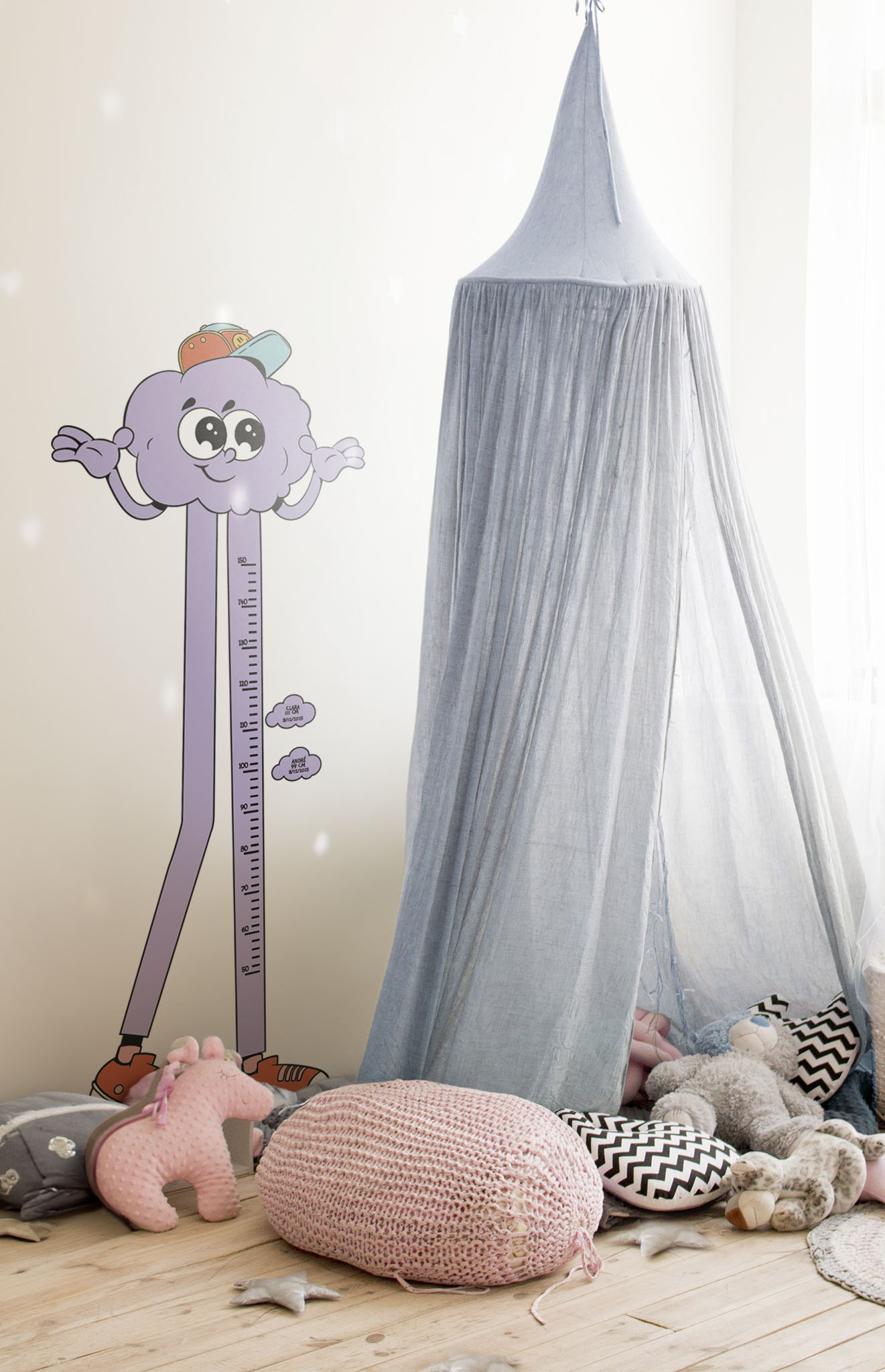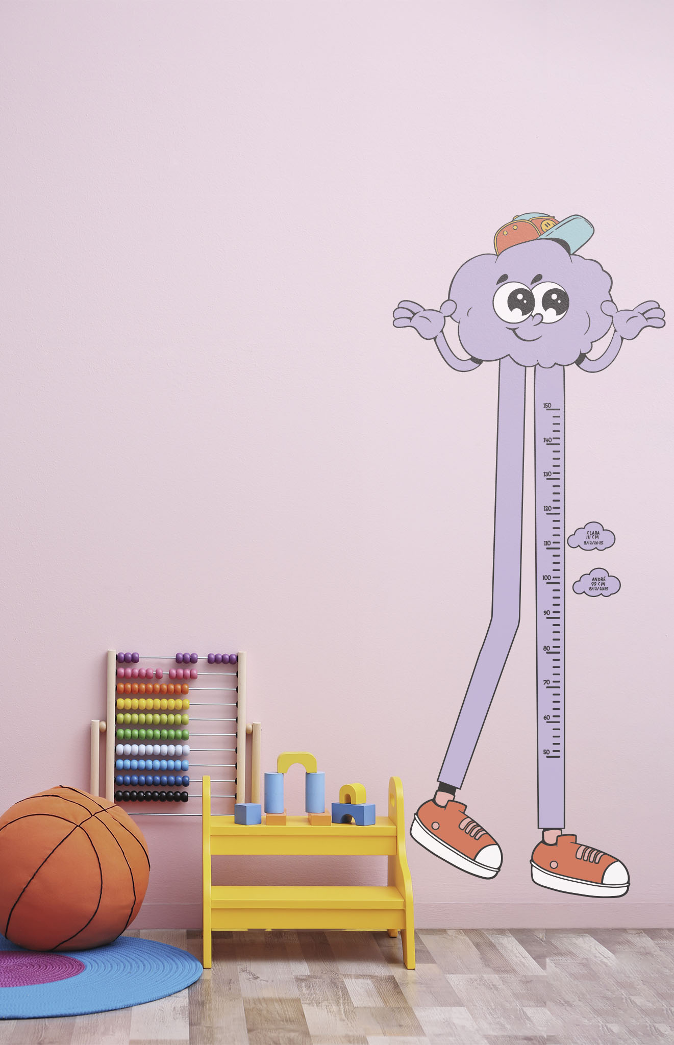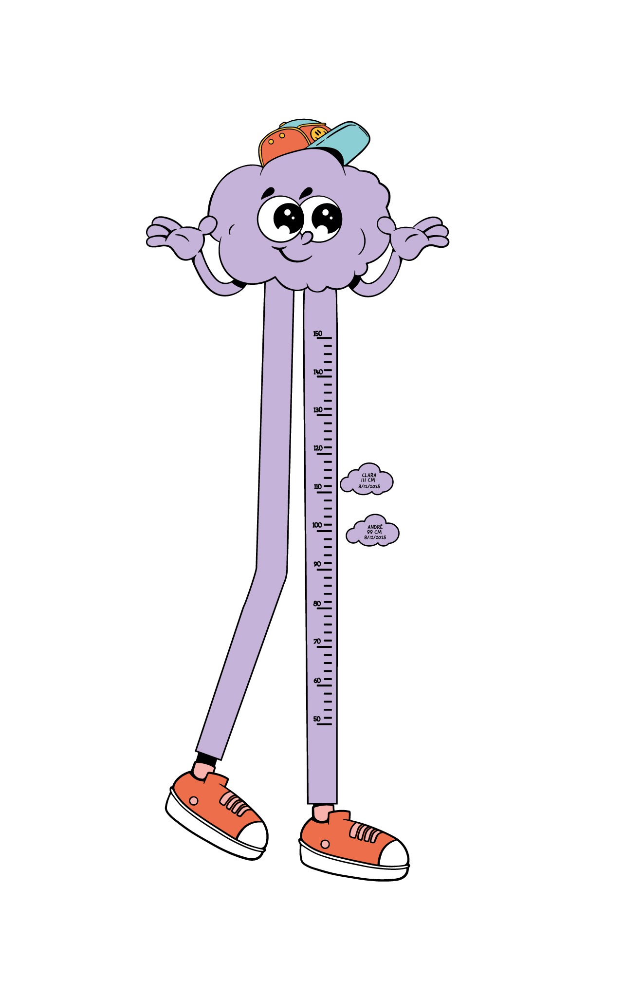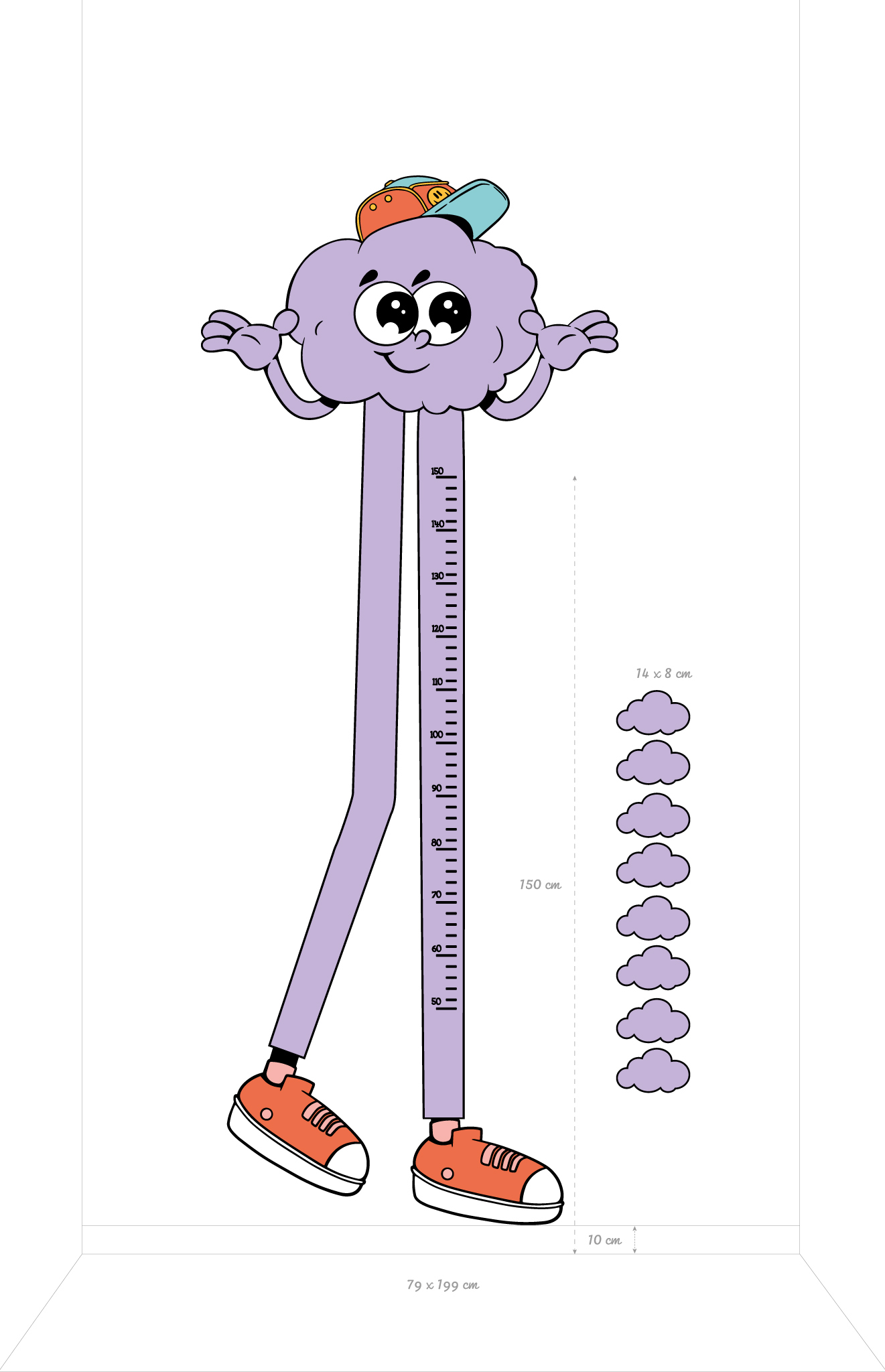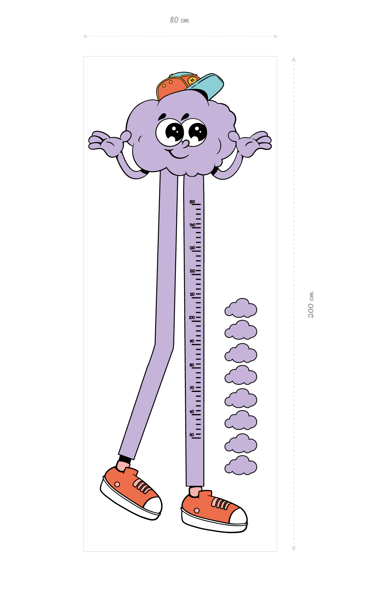 With a mischievous smile, stylish cap and flashy orange sneakers, this cloud wall sticker is ready to turn tracking your children’s growth into a fun and colourful moment. This cloud, straight out of a cartoon, stretches with its long purple legs to measure every inch, always with a smile!
