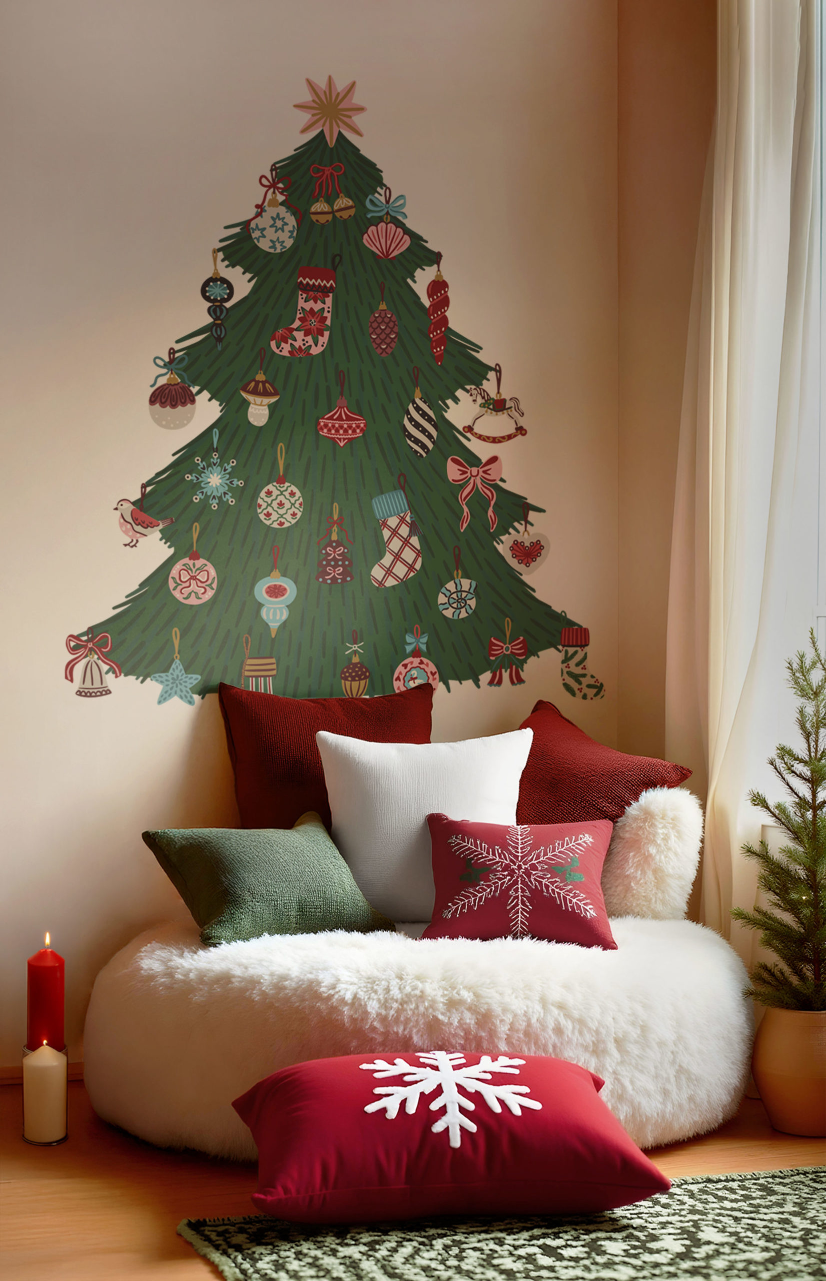 A large tree sticker (137 x 150 cm) + 30 repositionable decorations to create your own Christmas masterpiece.