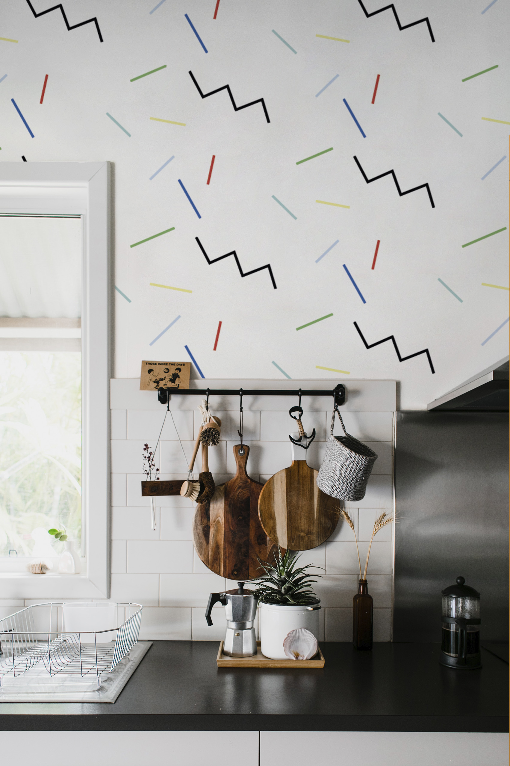 Looking for a deco look that really pops? Dare to use Memphis wallpaper in your bedroom, kitchen or living room. With its eye-catching design, our Nยฐ7 panoramic wallpaper will make all the difference.