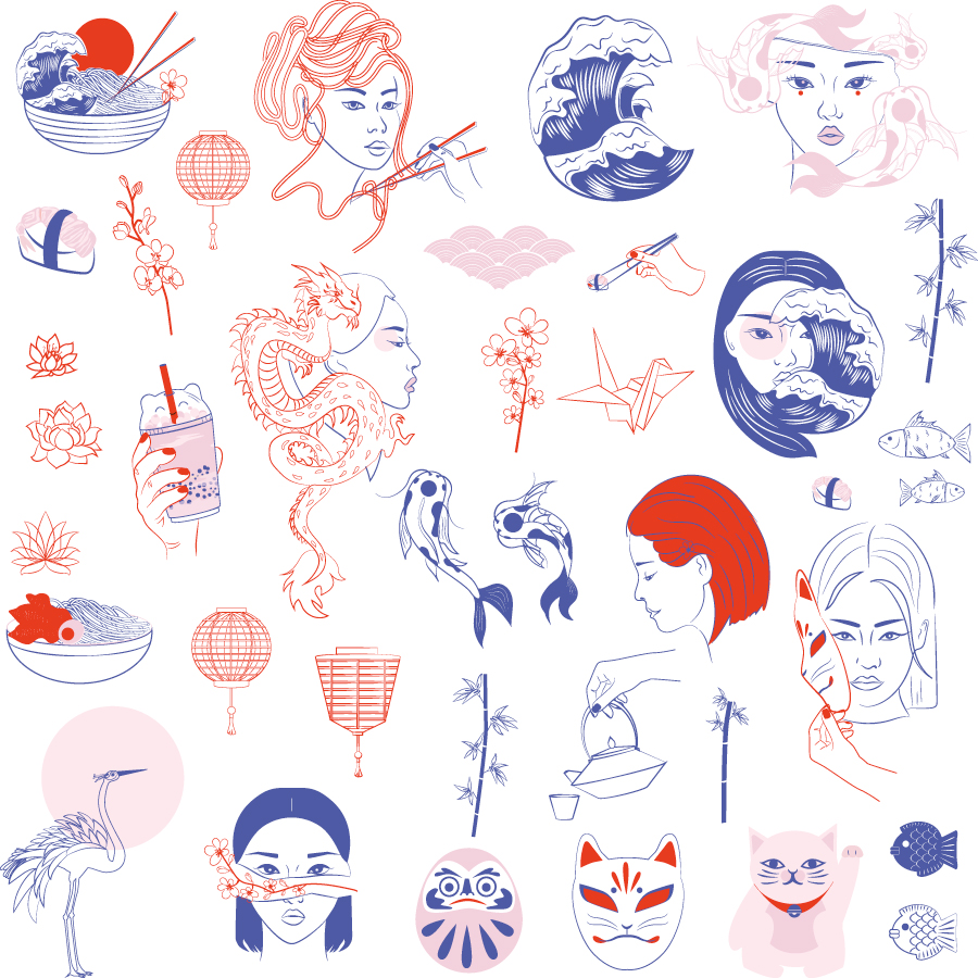From expressive faces to delicate fans, every element of “Love Japan” is an invitation to embrace J-pop culture in all its glory. Each illustration is a subtle yet playful nod to Japan’s cultural richness, ideal for aesthetes aspiring to interiors where history and modernity blend.