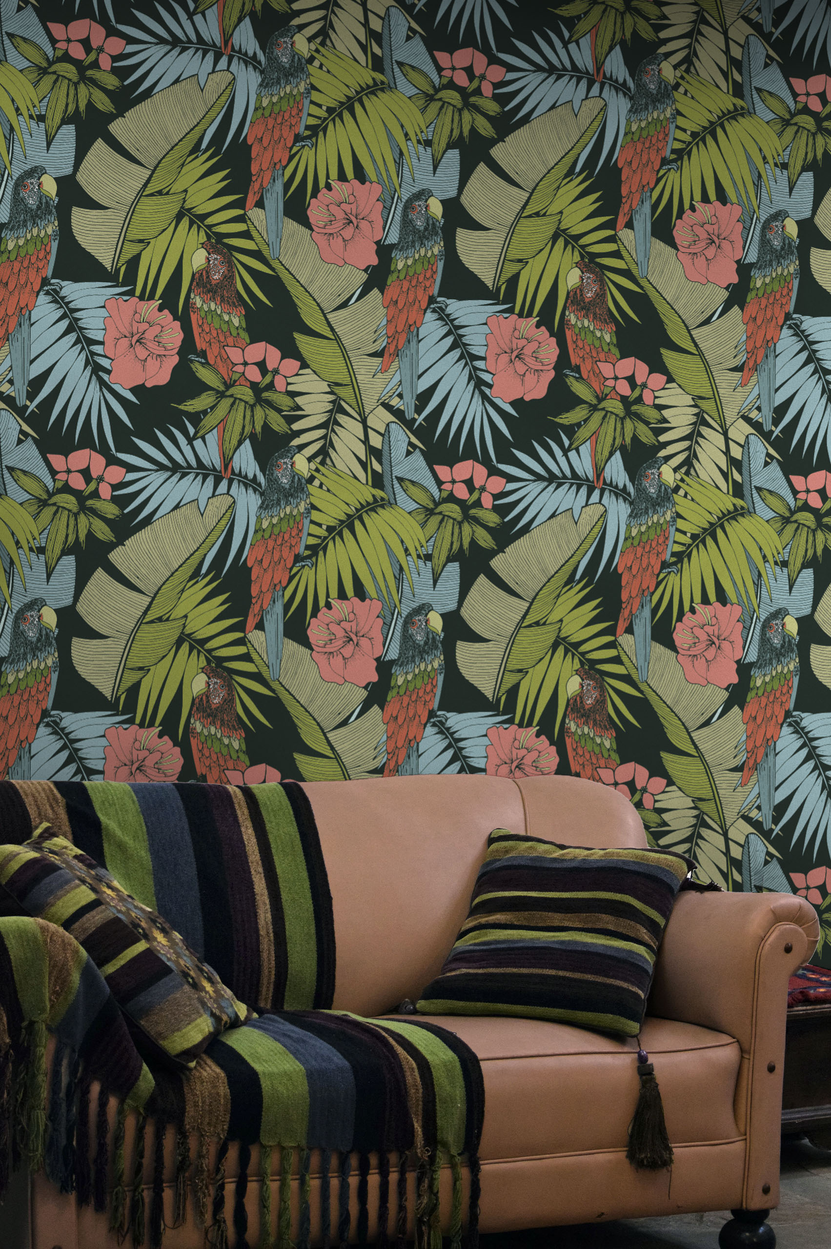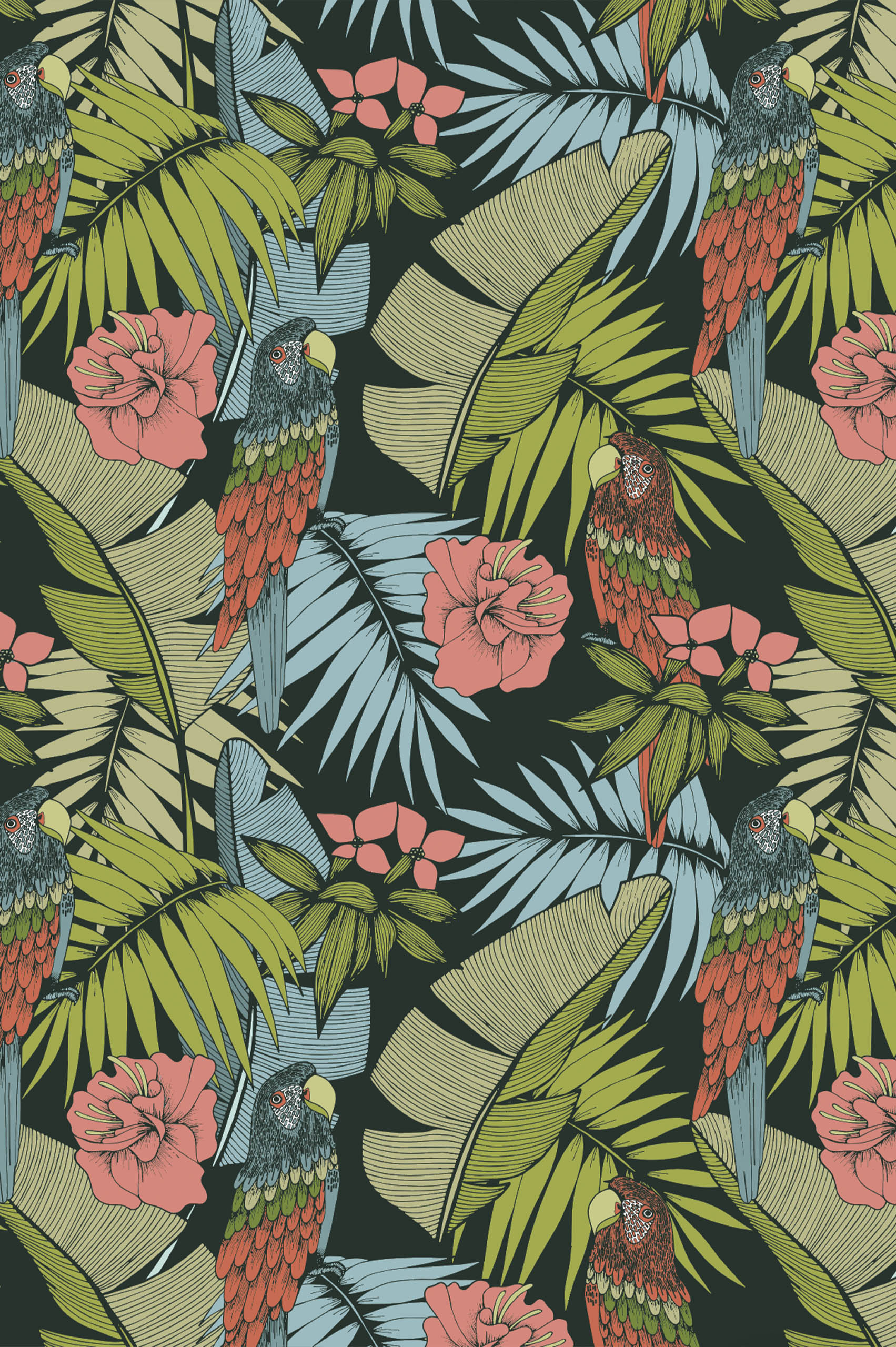 Succumb to the lush charm of “Tropico”, the wallpaper that brings tropical exuberance right into your home. This tableau vivant is a profusion of deep green palm leaves, bright hibiscus flowers and multicolored parrots that seem to converse between the foliage. Every detail is a celebration of the lush biodiversity of the tropics, an invitation to transform your interior into an oasis of freshness.
