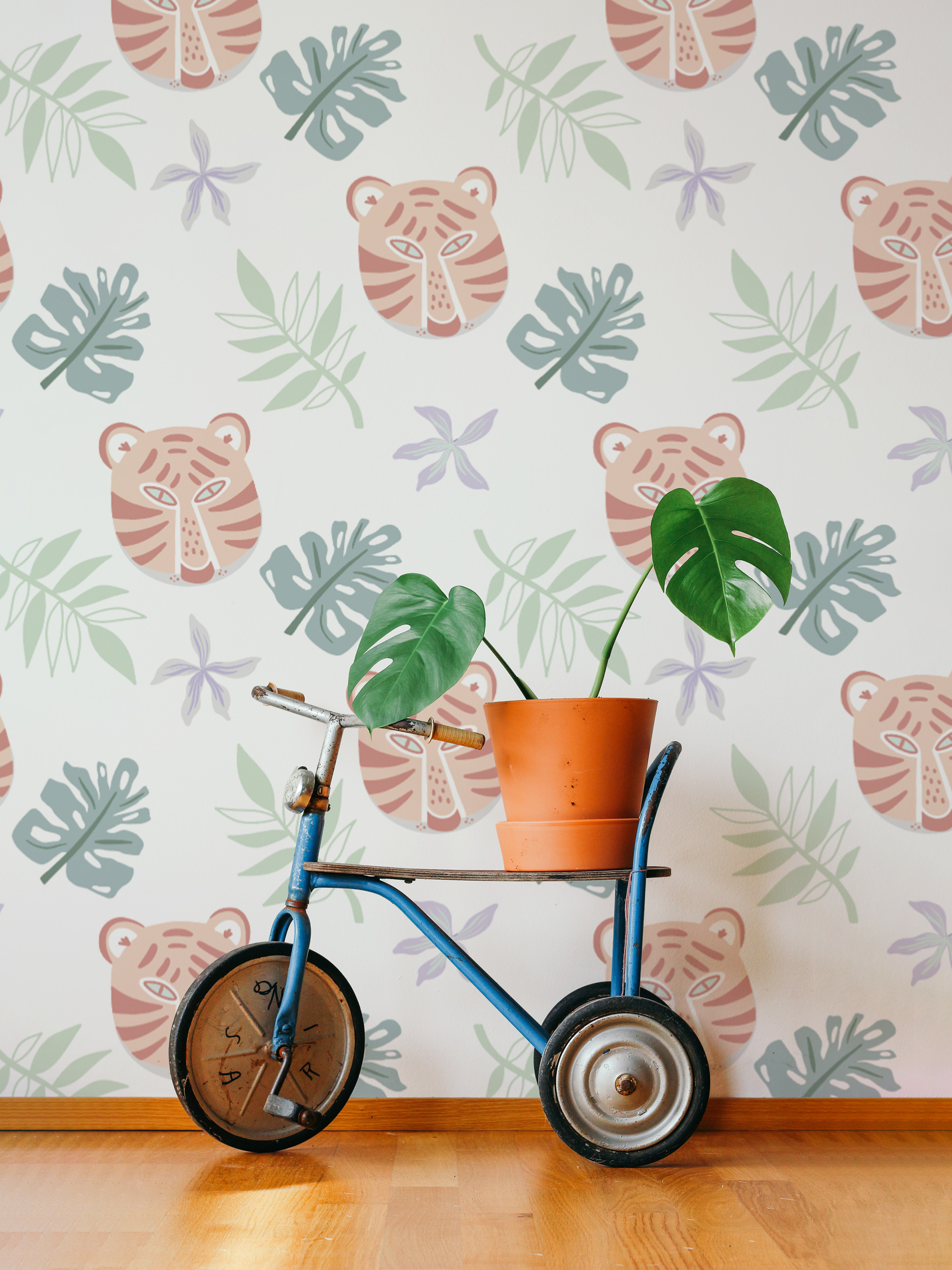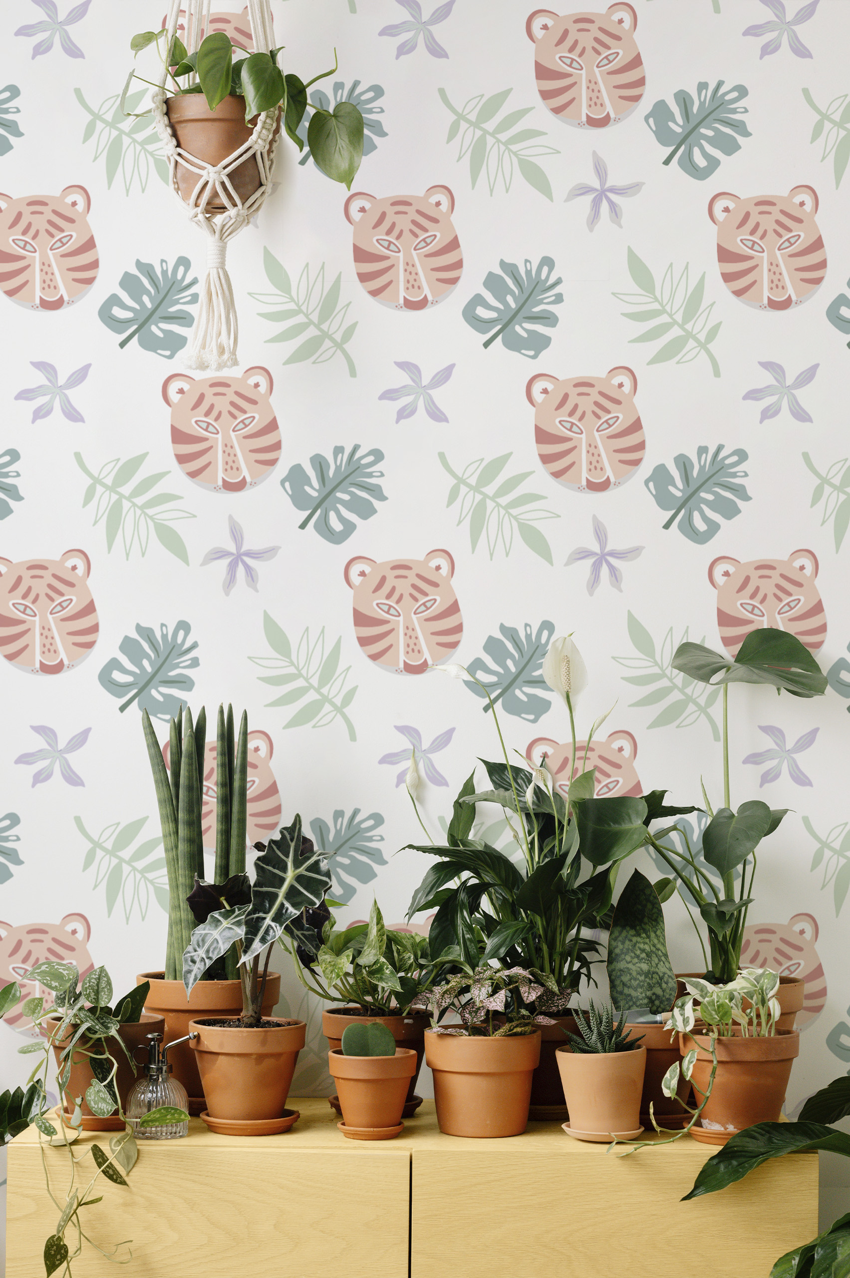 Our ‘Coloured Tigers’ wallpaper is an invitation to brighten up your home with a playful and artistic jungle essence. Dotted with stylized tigers and tropical leaves, this design combines the vigor of wildlife with the delicacy of pastel colors, creating an atmosphere that is both dynamic and soothing.