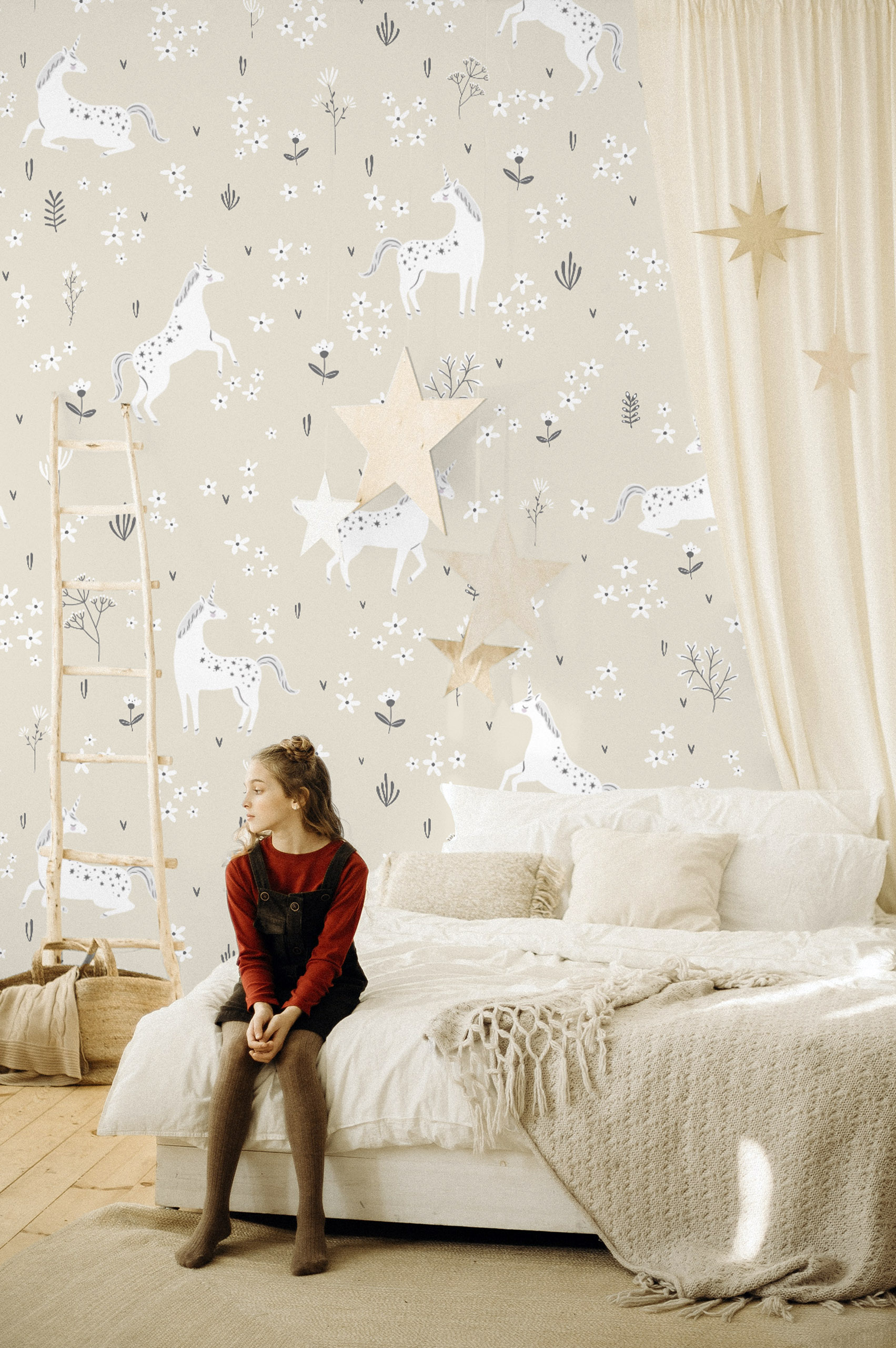 Our ‘Unicorn’ wallpaper transforms any room into a fairytale realm, where the graceful white silhouettes of these mythical creatures gallop among the stars and constellations. On a soft, neutral background, this pattern evokes purity and wonder, inviting you to dream in a world where everything is possible.