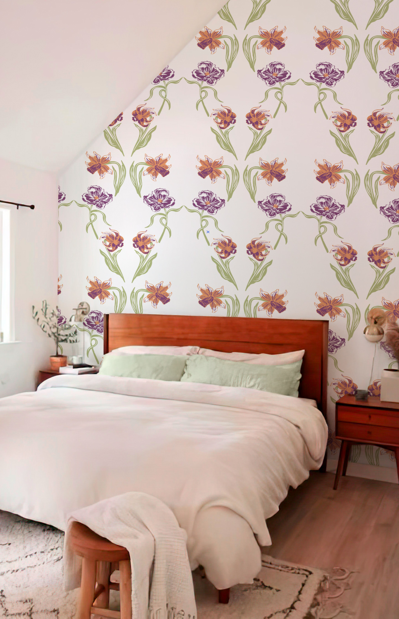 The “Enchanted Flowers” wallpaper features a delicate floral pattern. The stylized flowers, intertwined by graceful lines, invite serenity while adding a touch of nature to your interior. This design is ideal for creating a soft and welcoming atmosphere, perfect for a bedroom or living room. Combining modernity with natural charm, this wallpaper is a perfect choice for any interior design.