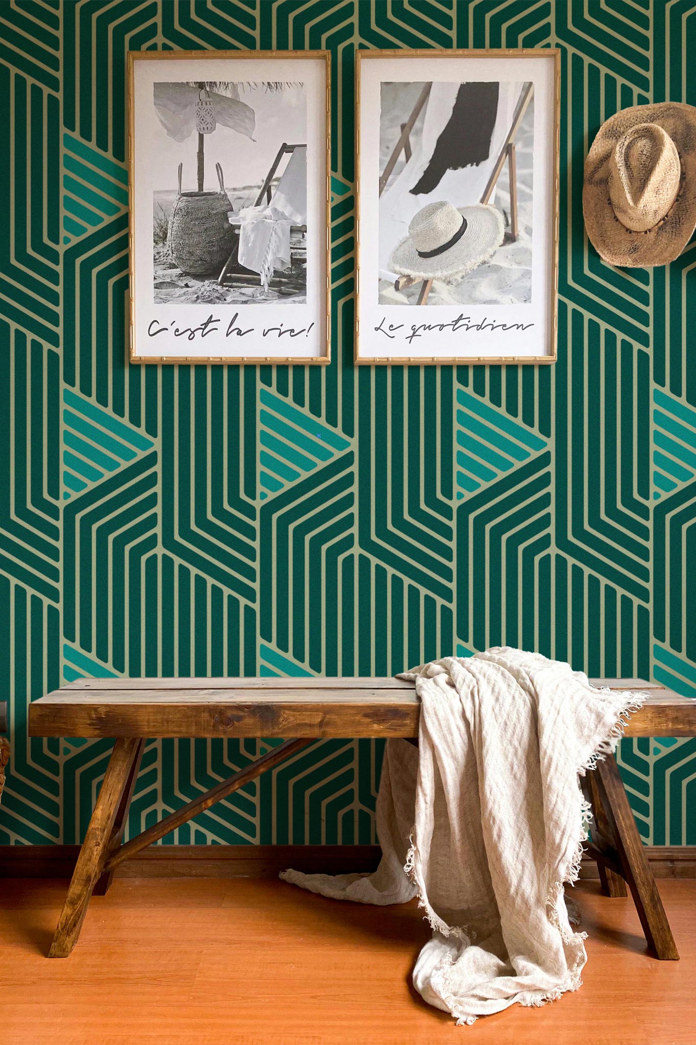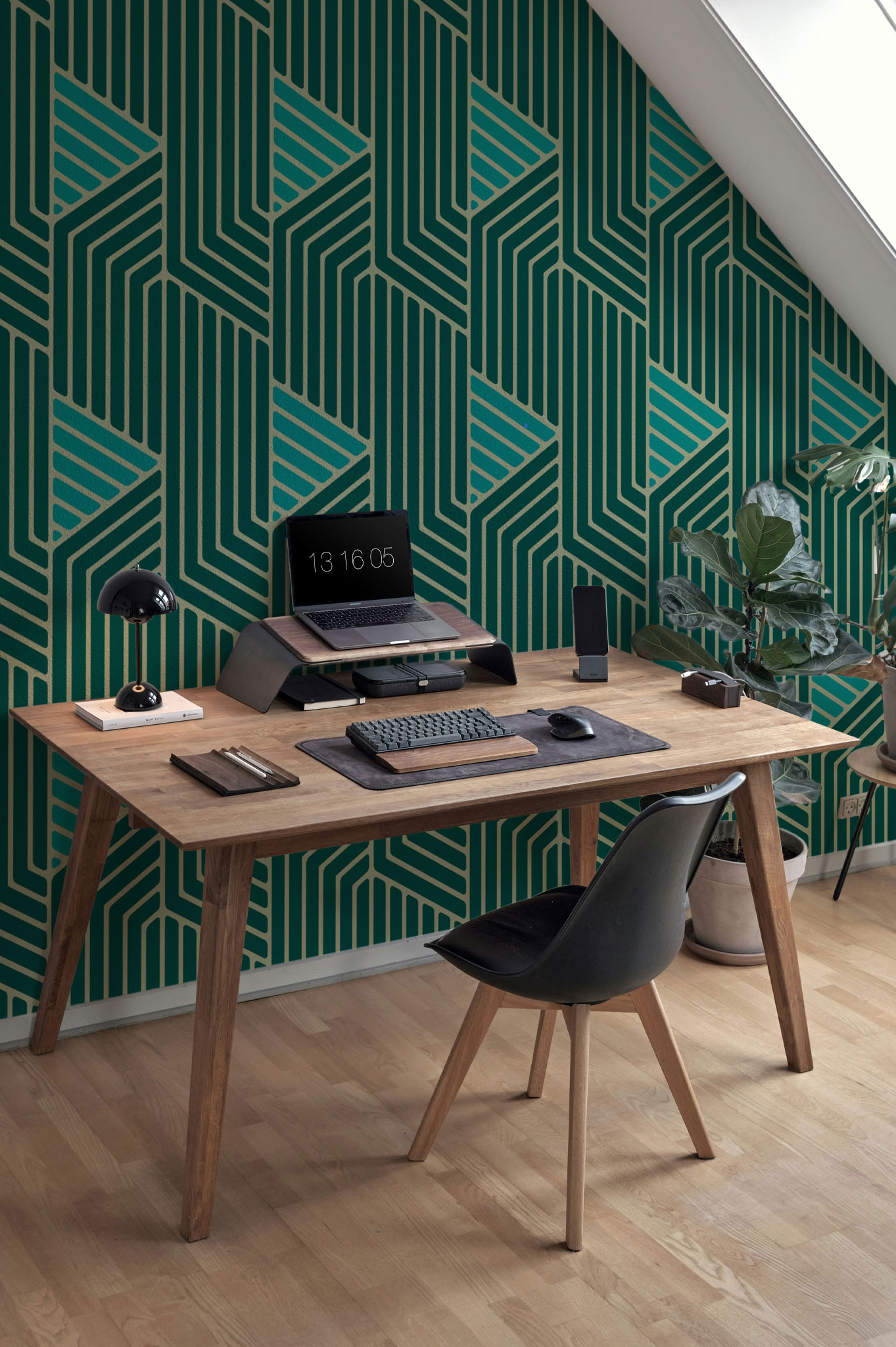 Dare to go modern with our geometric wallpaper, “Between the Lines”! This design has a rigorous and fluid look. The intersecting lines and triangular structures create an effect of depth, evoking a journey through sophisticated architecture. Whether in an office, living room or bathroom, this wallpaper lends itself to a multitude of interior styles, both trendy and timeless. Add a touch of elegance to your space with this product available in three color variations: terracotta, blue and green.