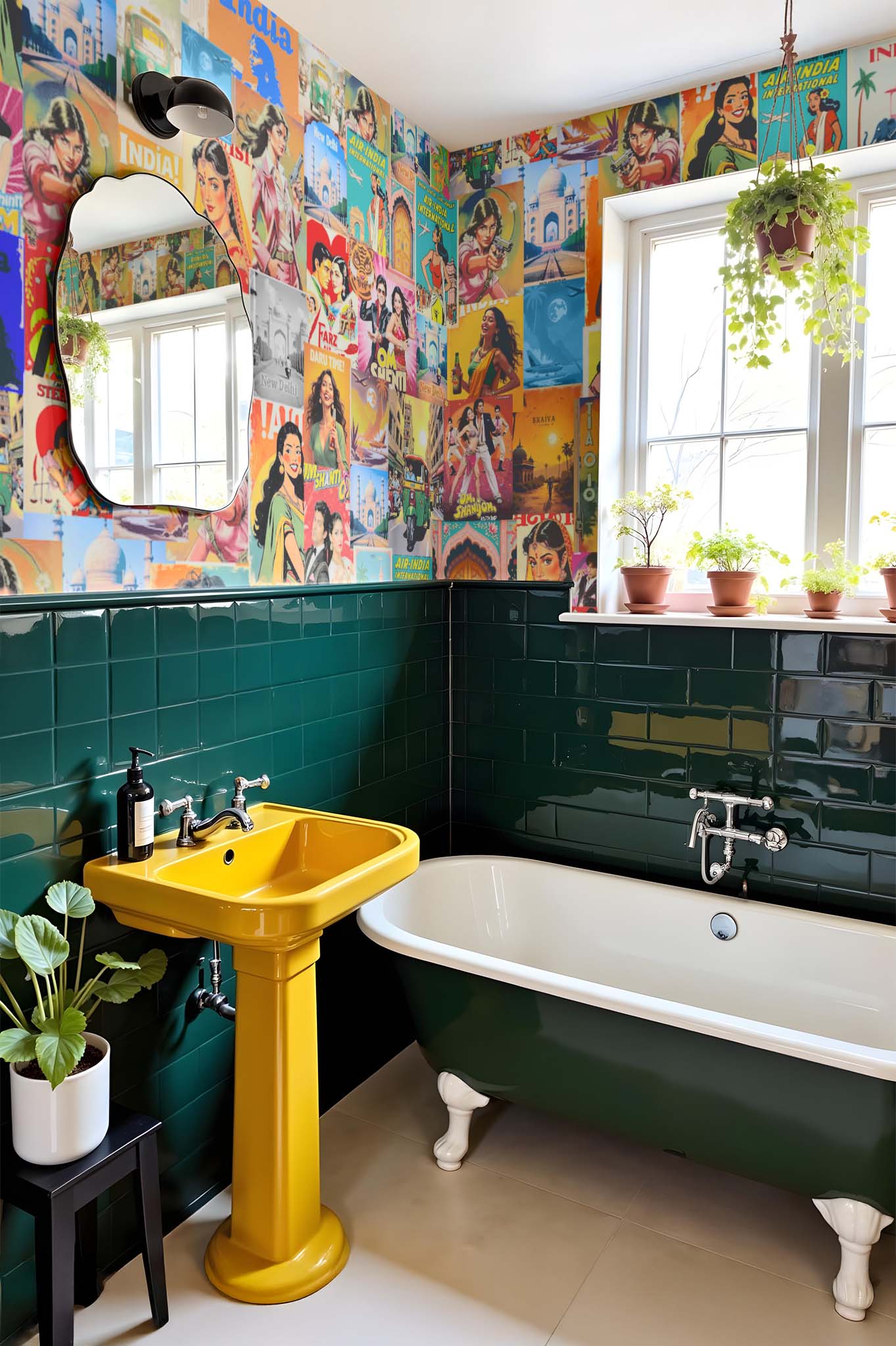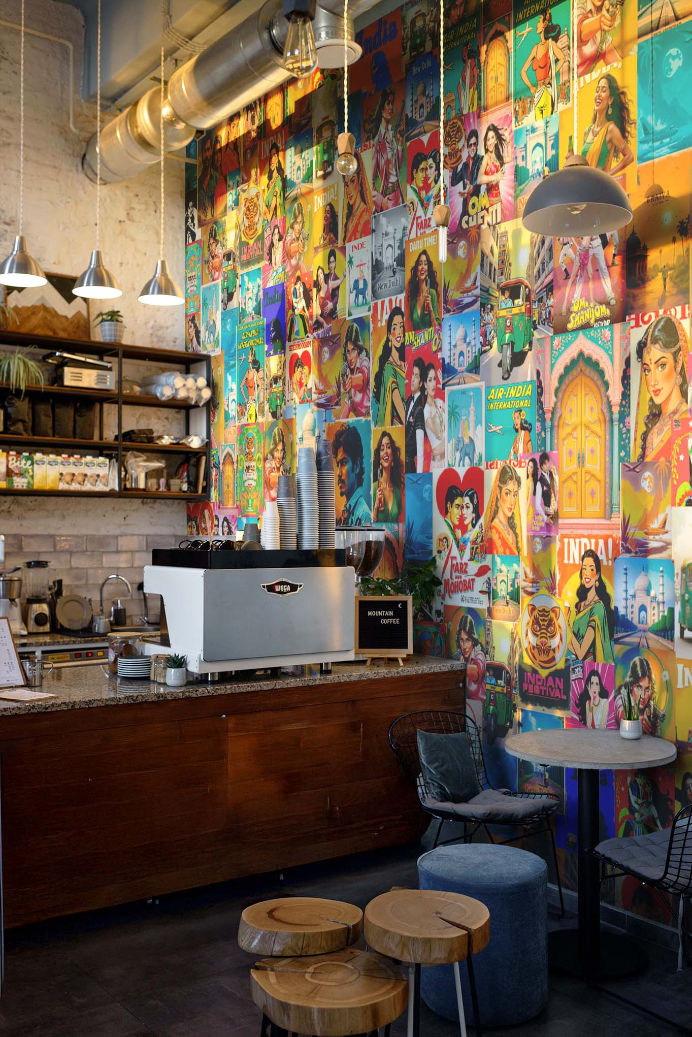 “Bollywood Vibes” is a wallpaper that makes your walls dance to the rhythm of Indian film posters. With its vibrant illustrations and contagious energy, this modern design acclimatizes to any space, whether it’s in a trendy café or at home. Hungry for colour? Opt for our multicolored version!