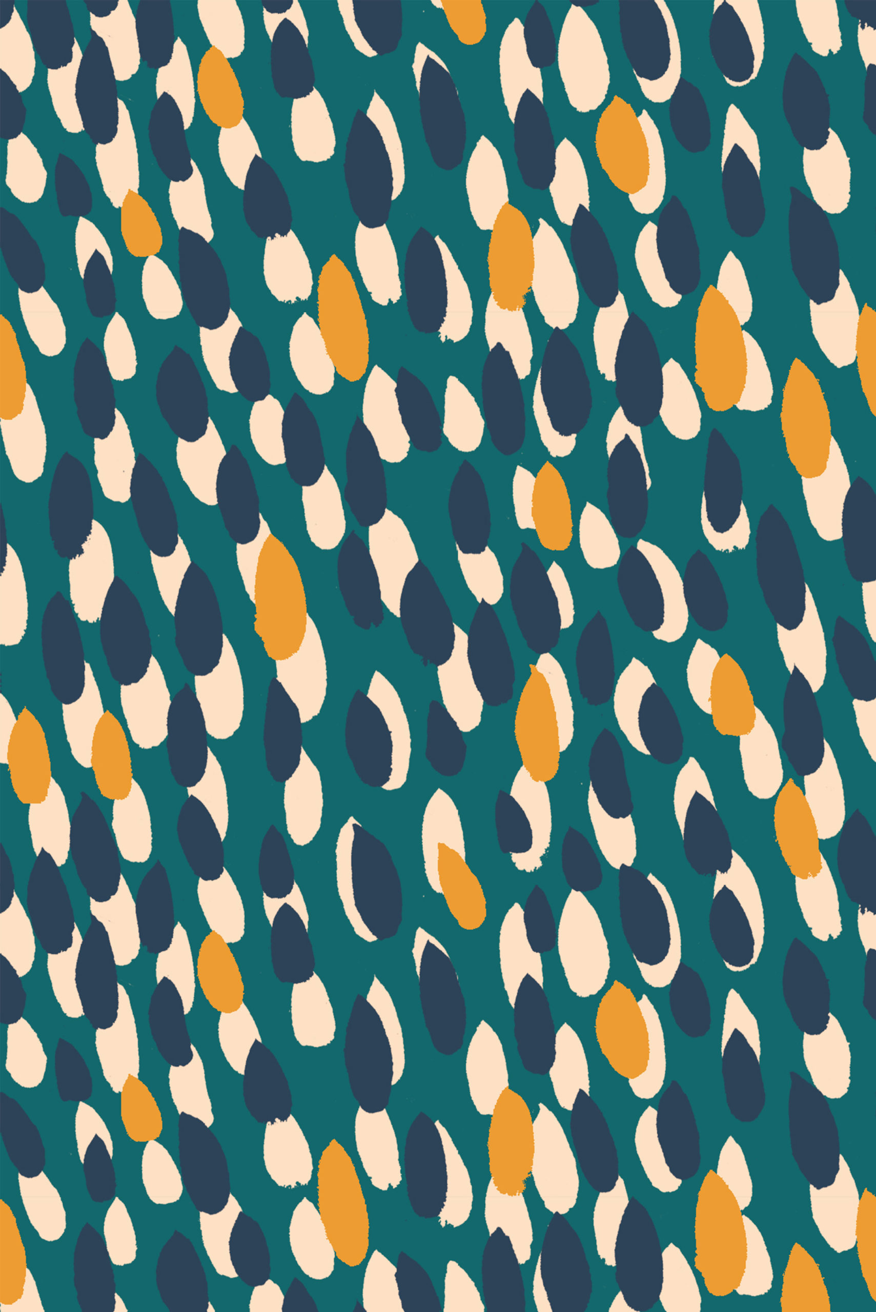 The ‘Water Drops’ wallpaper is a refreshing celebration of form and colour, capturing the essence of spring rain against a deep forest green background. Each drop, tinged with indigo, cream, and amber, is an artistic touch, a reminder of the rosy mornings and the beneficial showers that revive the earth.