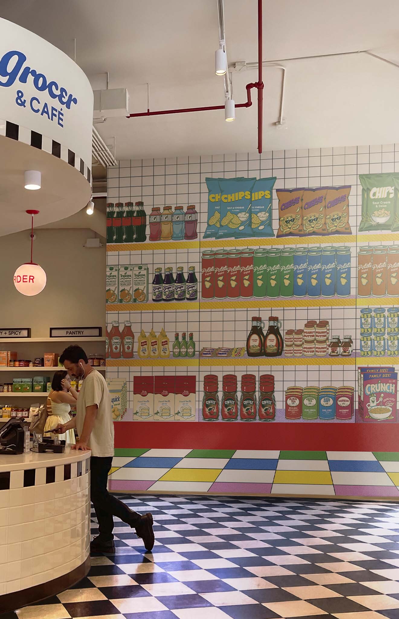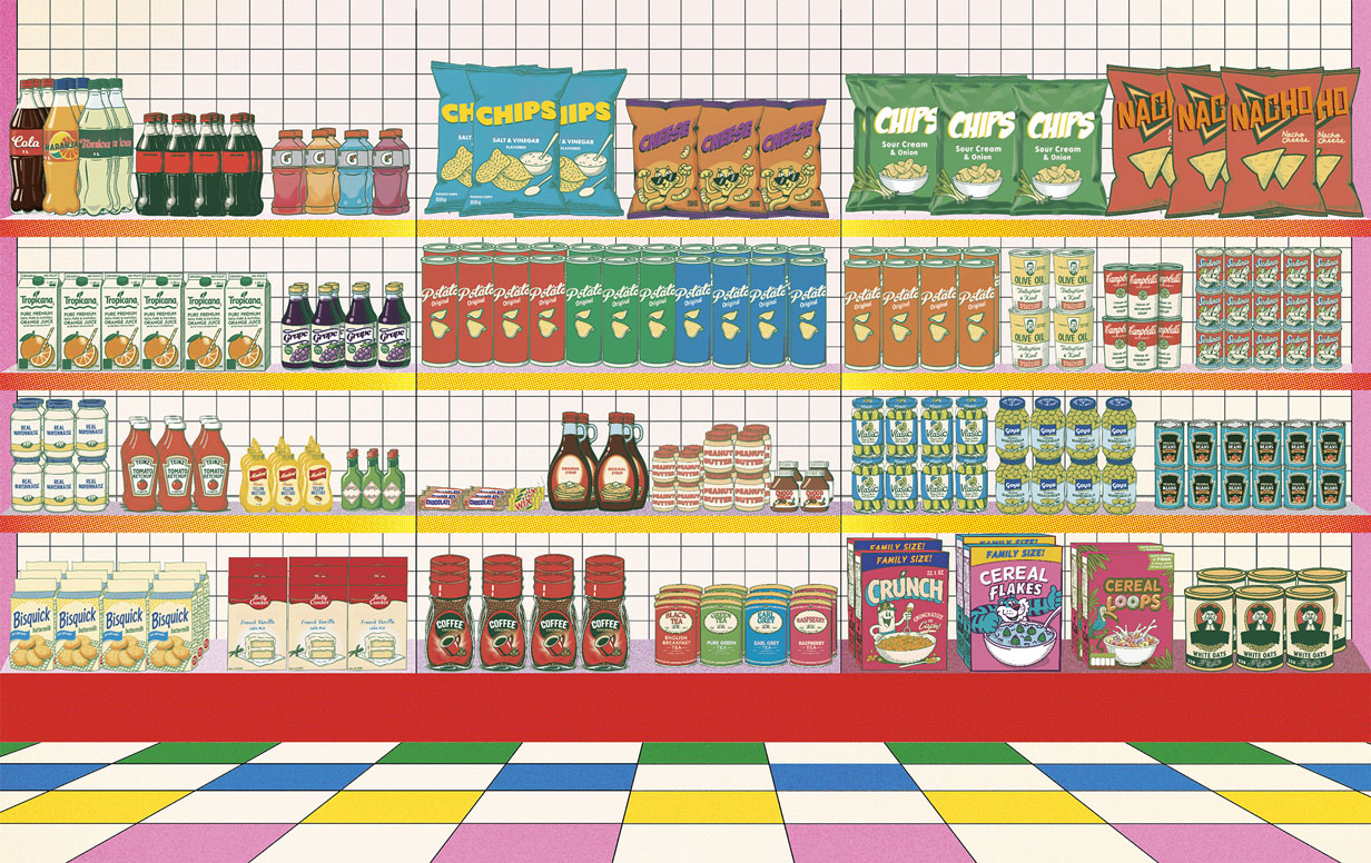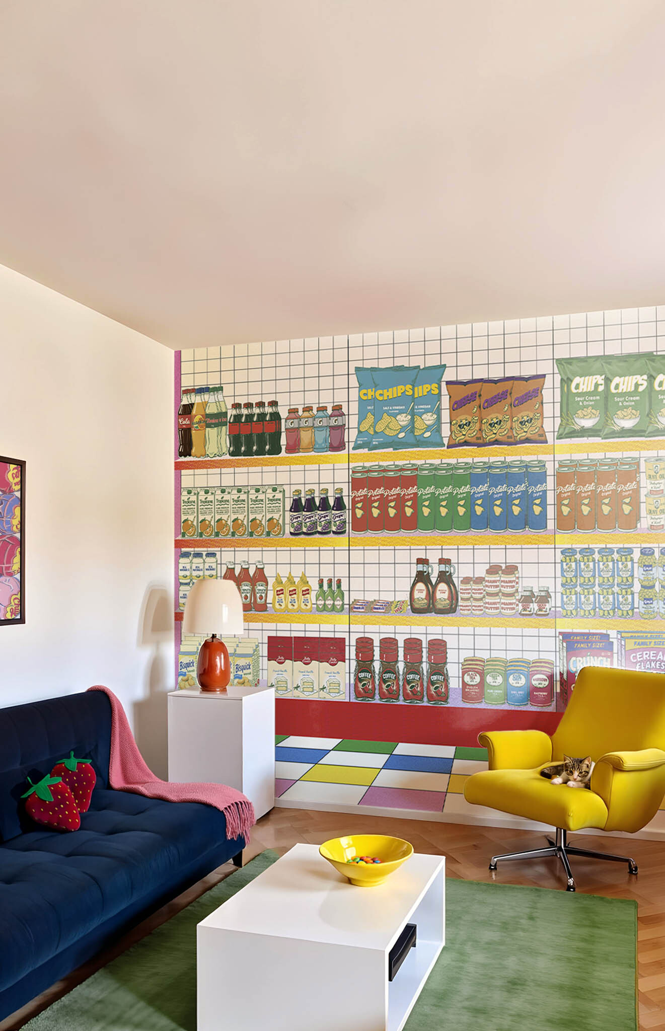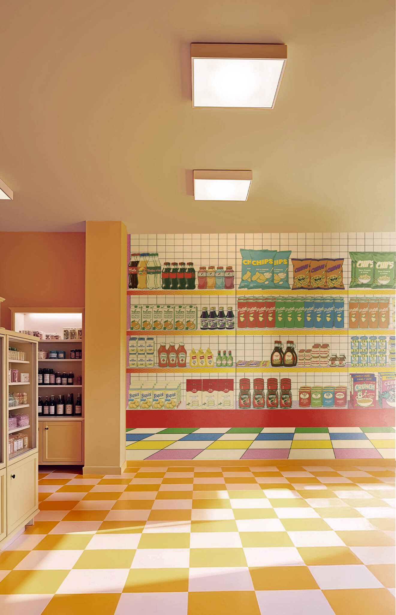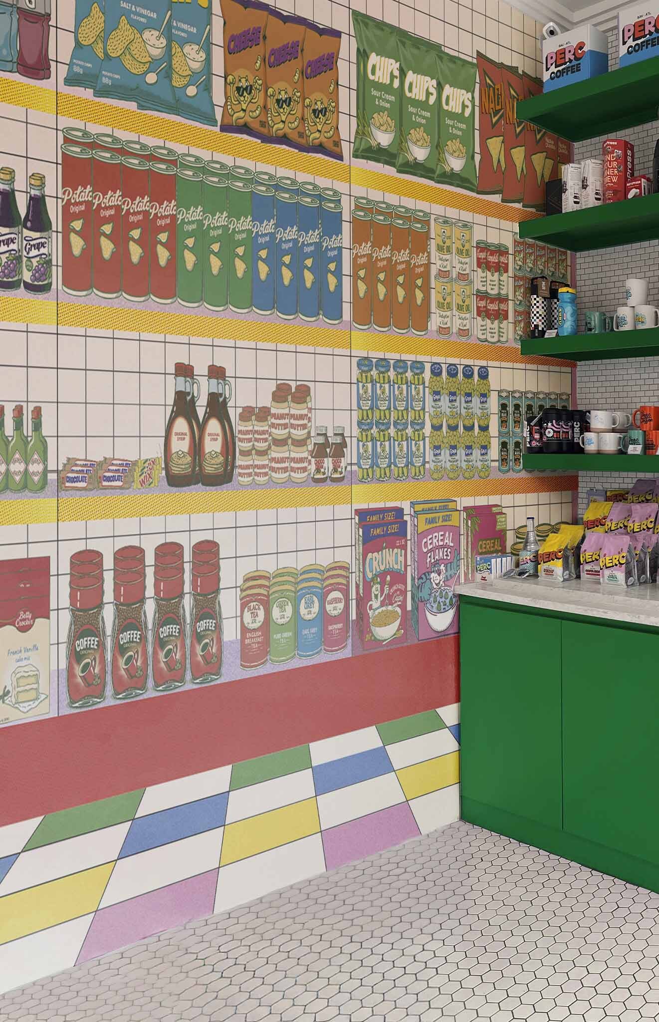 “Supermarket” revisits the world of the market with a sparkling design! This wallpaper features a multitude of products such as sparkling bottles, crispy crisps and other delicacies, all arranged with a graphic style reminiscent of vintage advertisements. With its clean lines, familiar icons, and friendly vibe, this pattern is sure to take your guests on a nostalgic journey to the land of good old groceries. What better way to make your visitors smile?