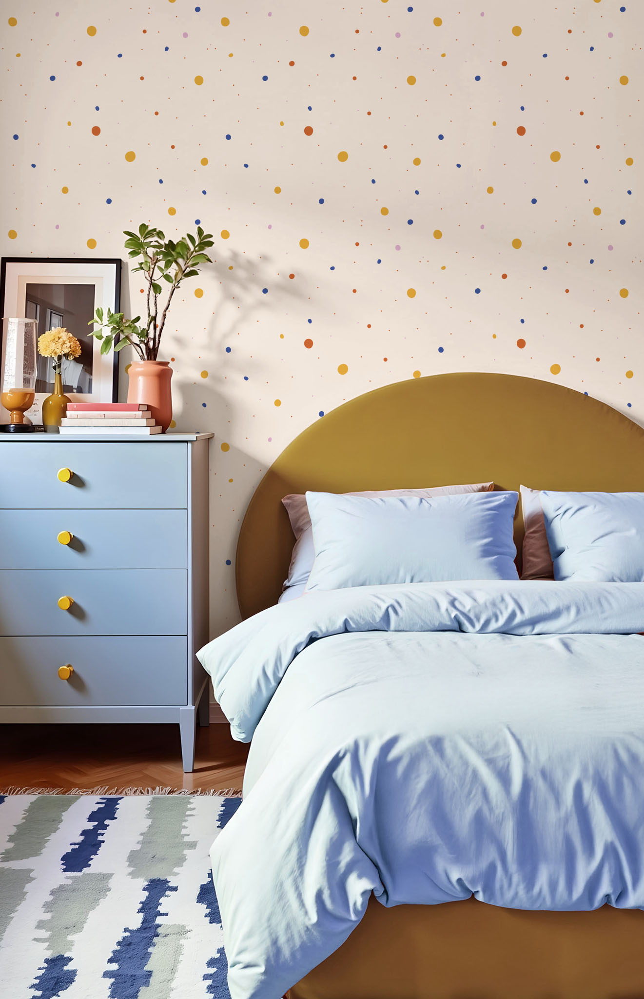 “Fête des Points!” Immerse yourself in a festive game where small multicolored dots hang from your walls like confetti. This wallpaper energizes any room, adding just the right amount of pep to make your décor shine. Perfect for a kitchen area or living room pop and full of life.