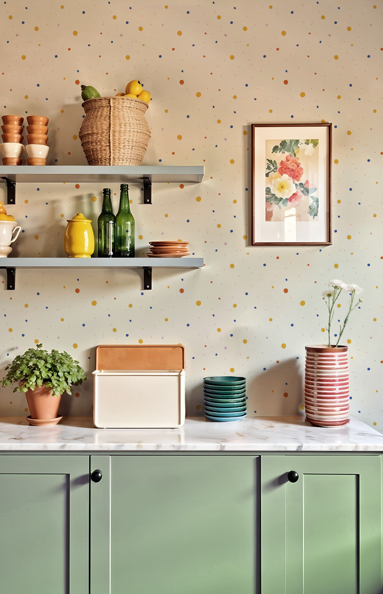 Dare to be carefree with our “Fête des Points” wallpaper! A sparkling design where colorful circles scatter on your wall like a shower of candy. This playful pattern warms up the mood, evoking a festive and cheerful atmosphere, perfect for decorating your kitchen or living room. The round shapes are an invitation to conviviality, making this space both welcoming and full of personality. Available in several variations, such as green, terracotta, and a bright multicolor, each version is sure to seduce your guests. Perfect for bringing vibrancy to any room, this wallpaper adapts to any style without ever compromising on fun!