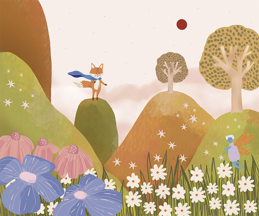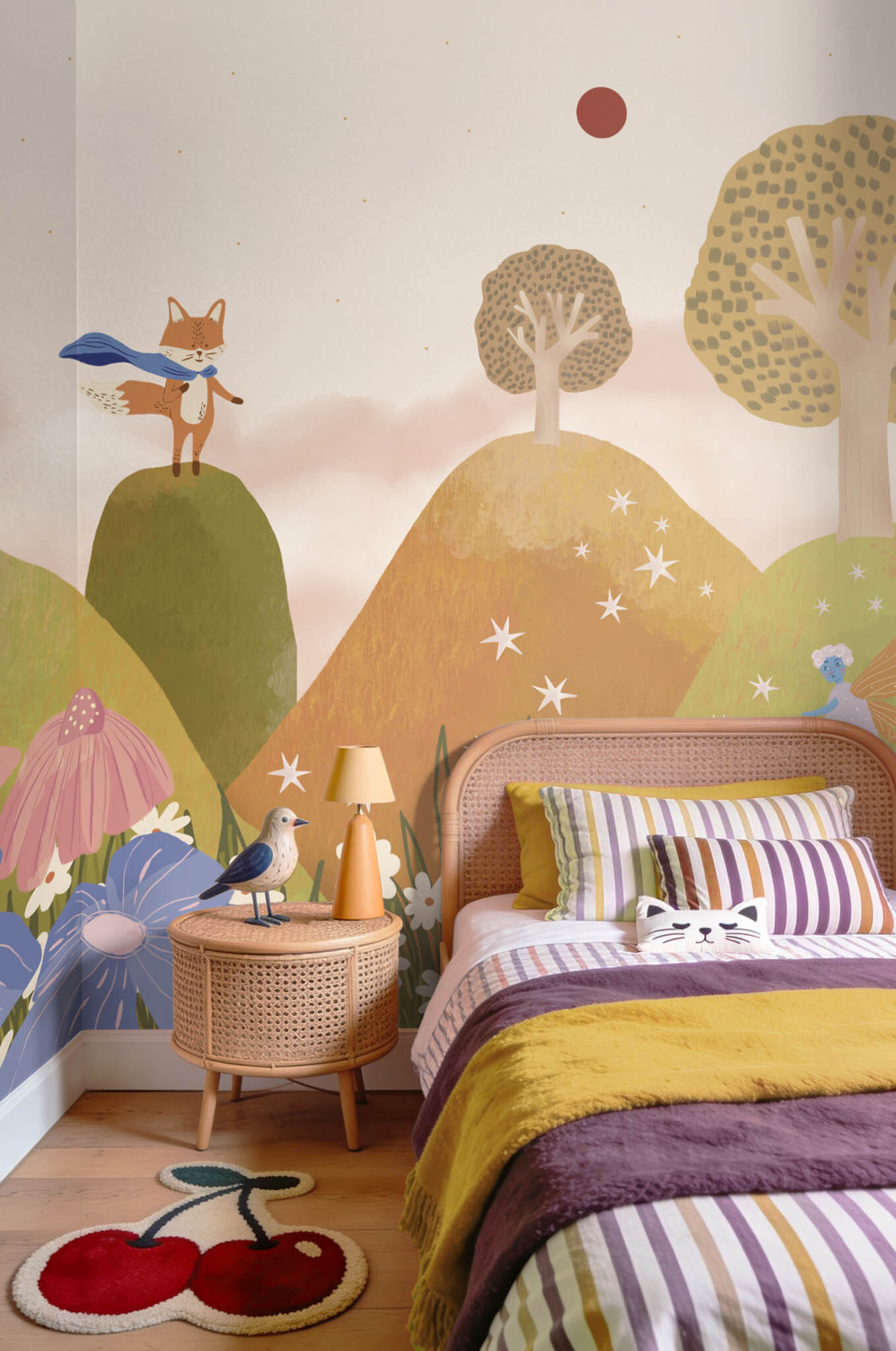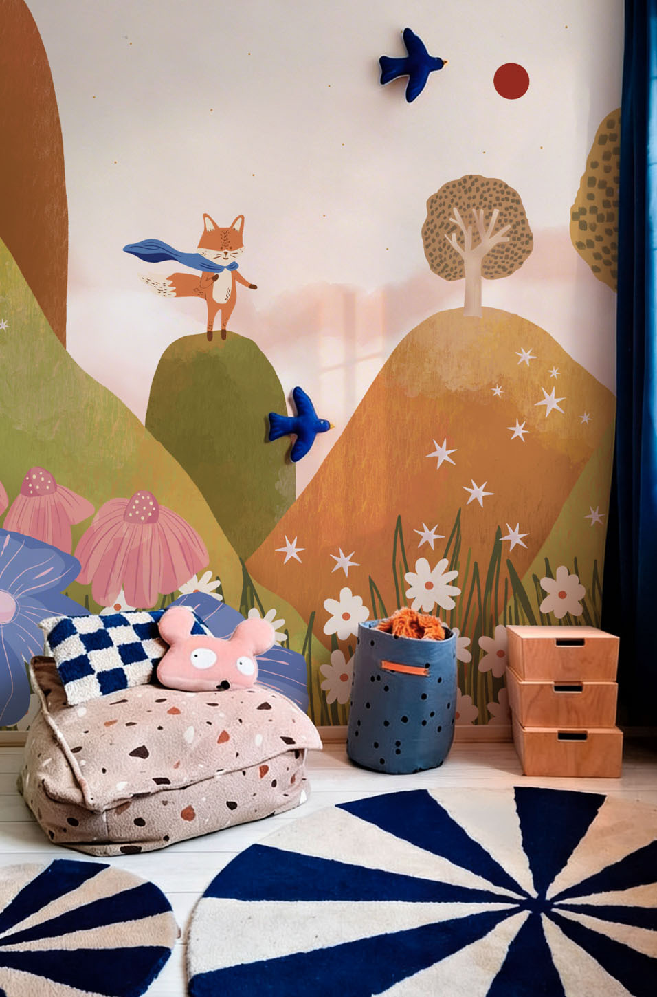 “Enchanted Valley” is a panoramic wallpaper that invites dreams and adventures to come to your little ones’ room. With its jovial hills, ruffled trees, and mischievous flowers, it transforms every wall into a living painting. Perfect for awakening the imagination and making children’s hearts capsize. Available in green and multicolor to suit any creative mood! 🌼🦊