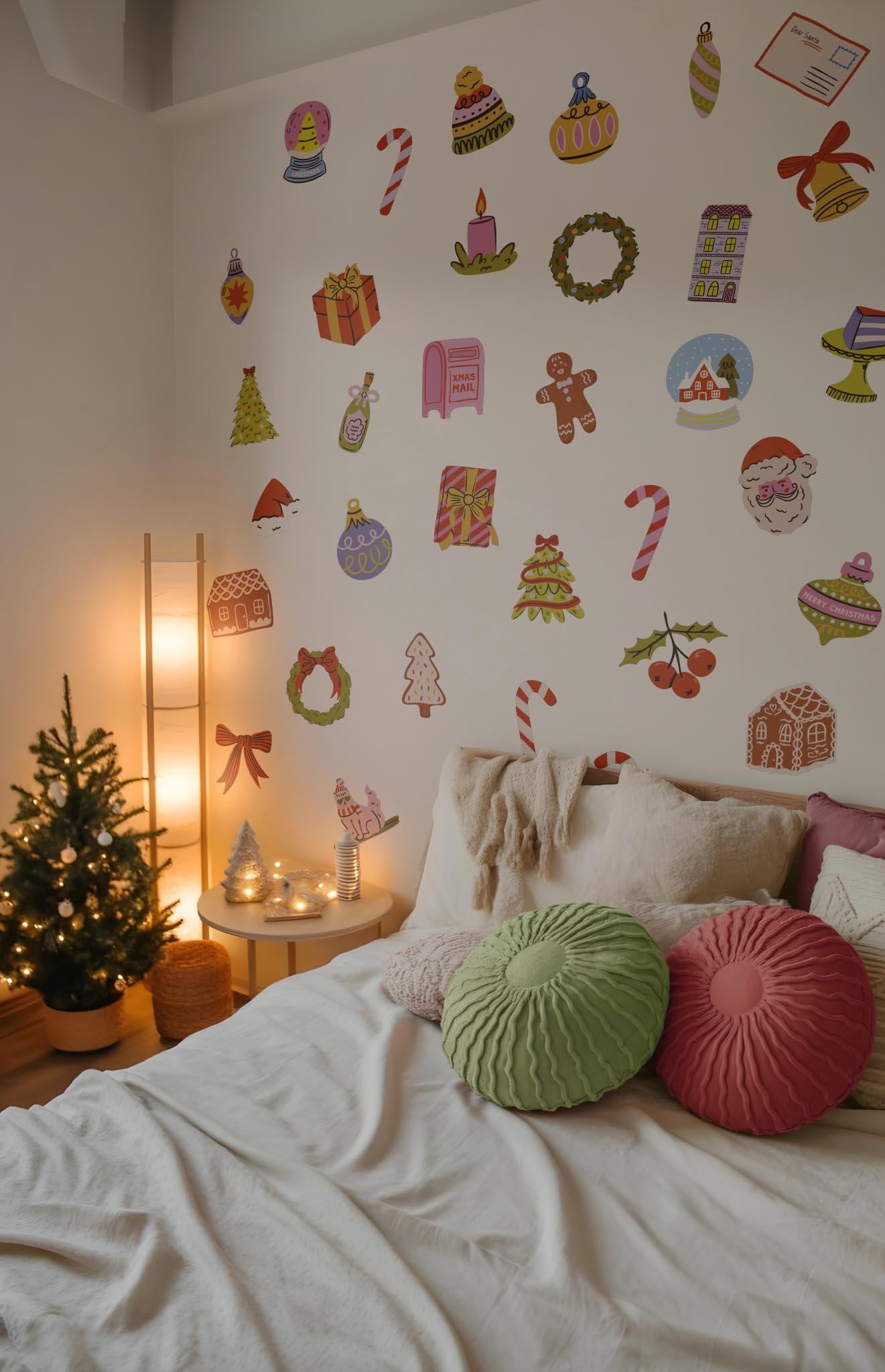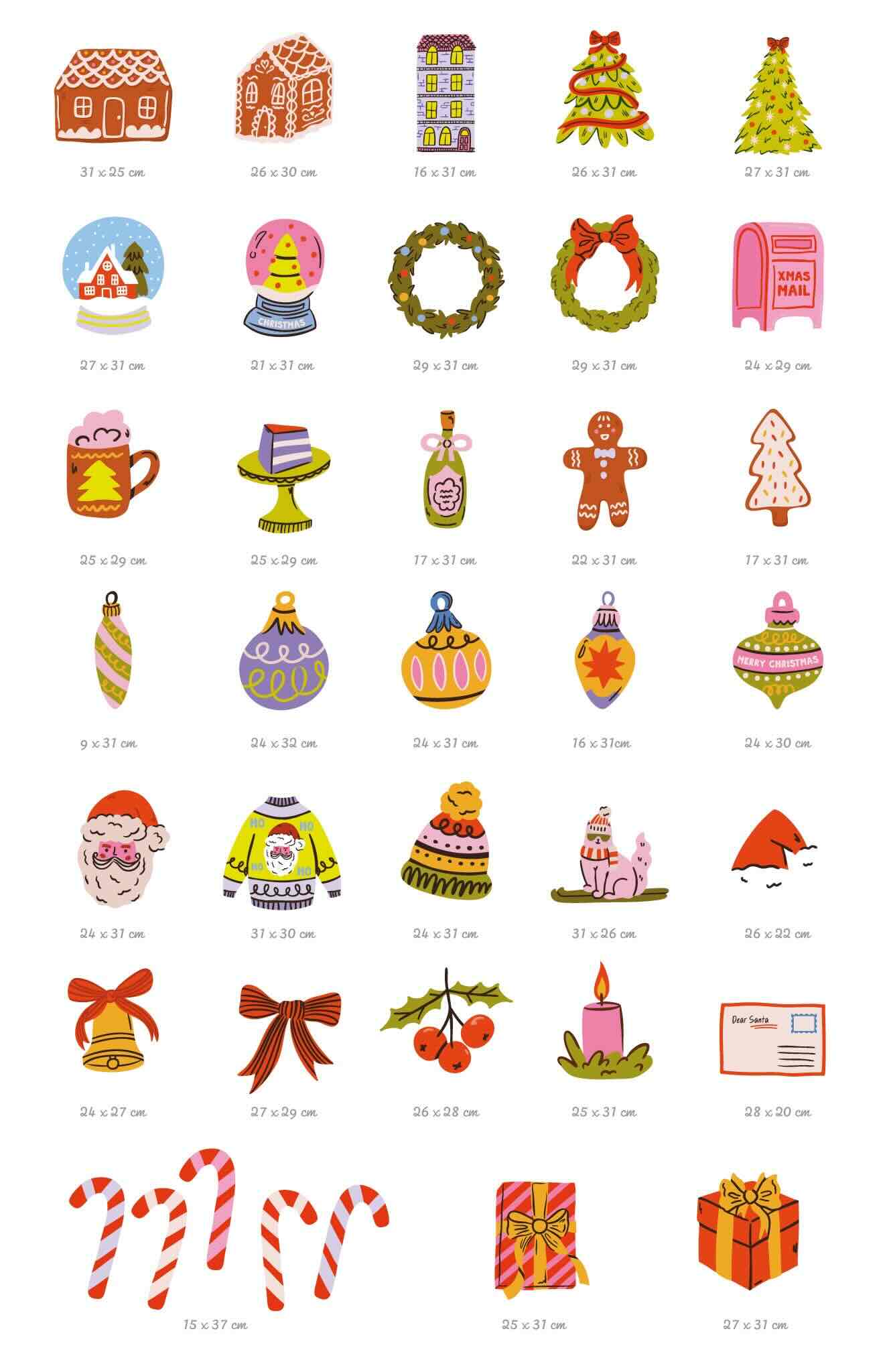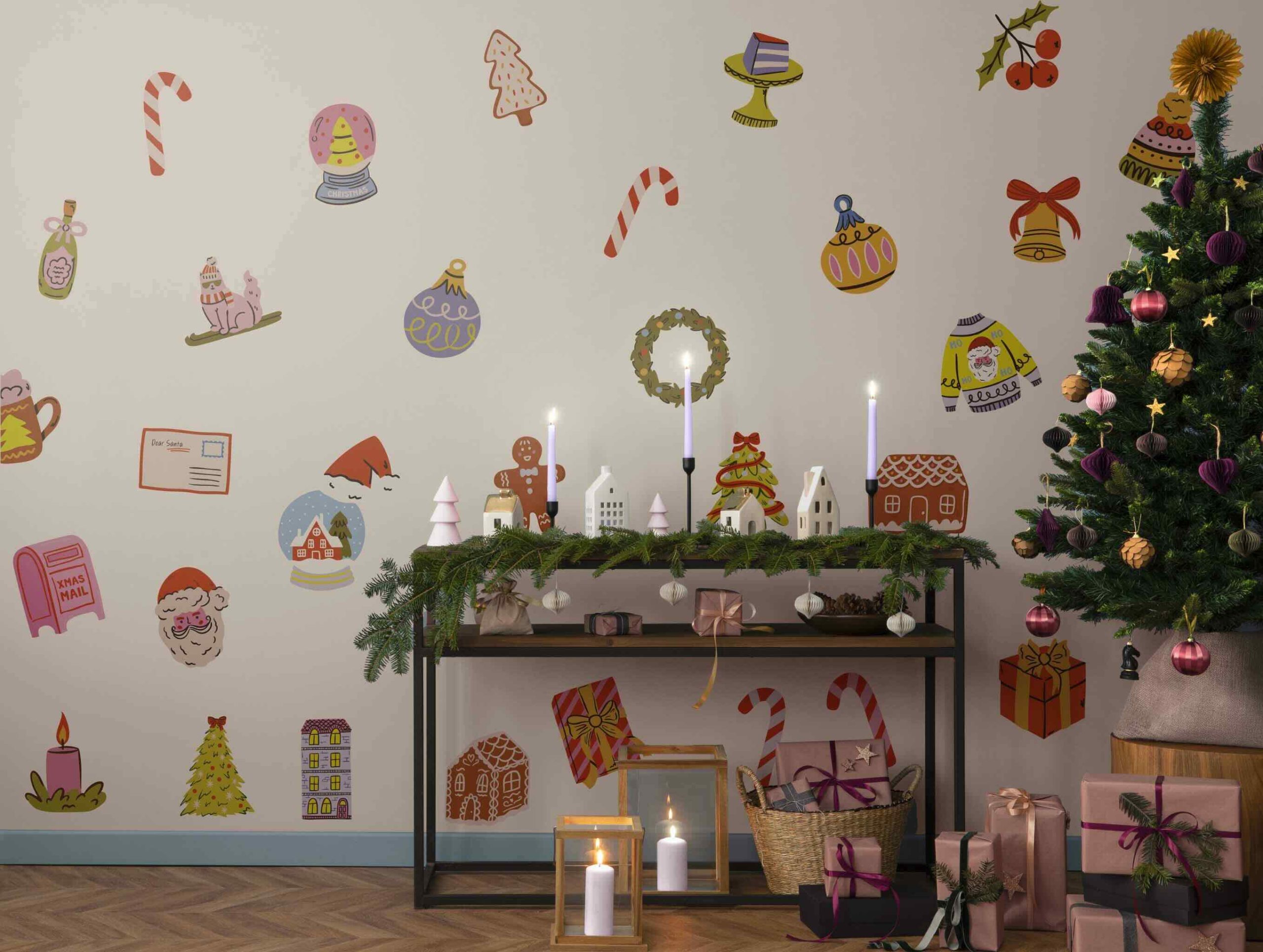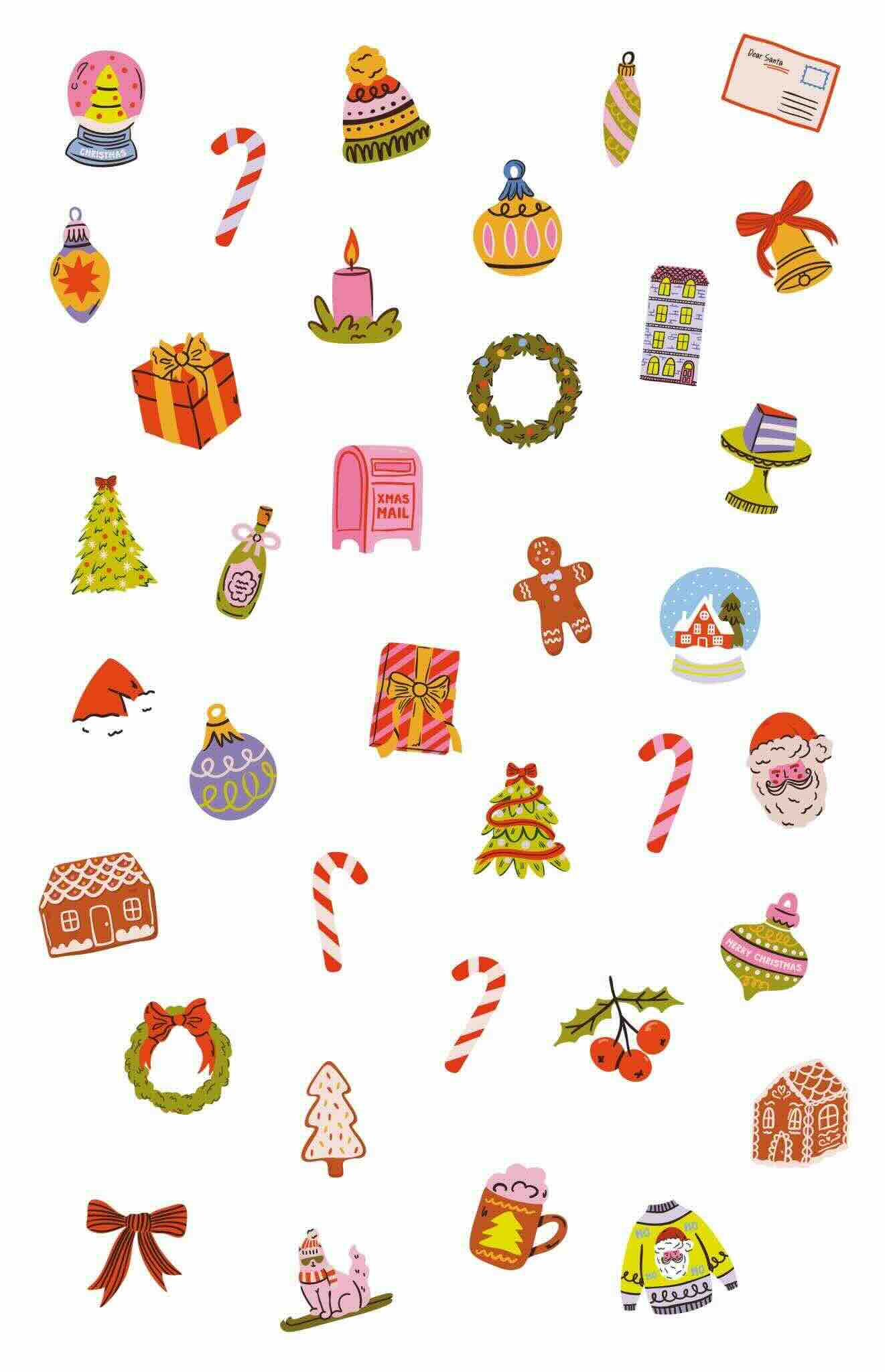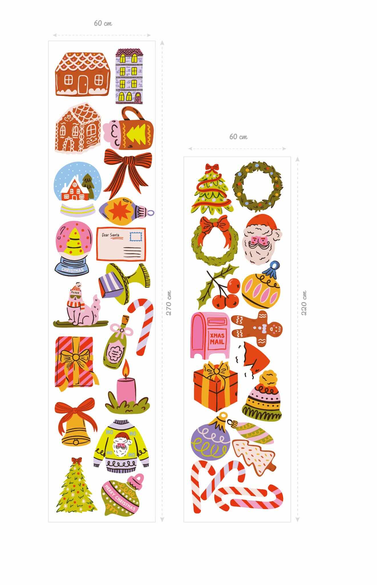 Between gingerbread houses, decorated Christmas trees, festive wreaths, gingerbread men, sparkling baubles, candy canes, and gift packages, each sticker brings a touch of joy and color to your home.