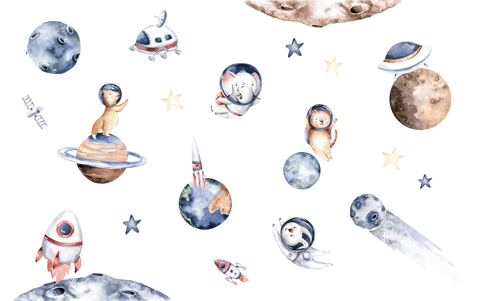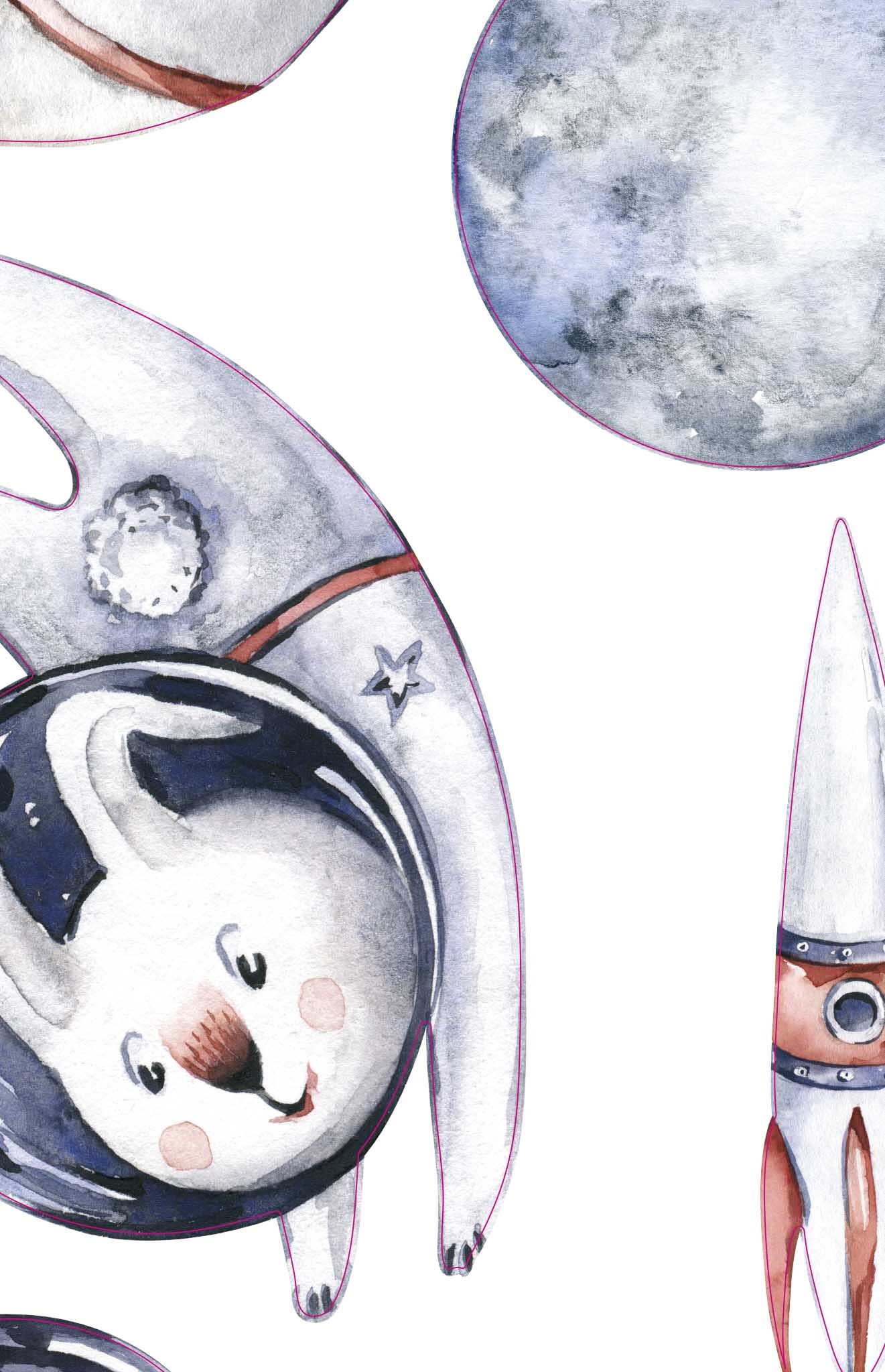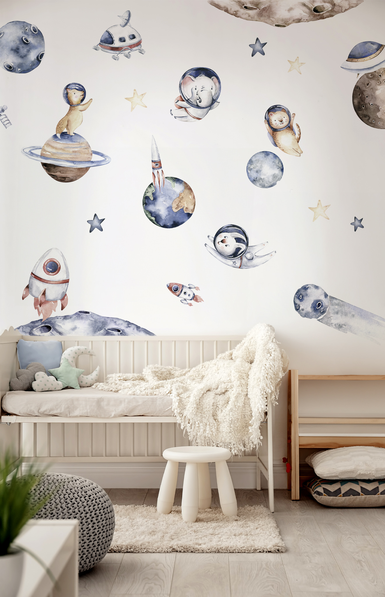 Transform your child’s room into a celestial universe with our space-themed wall stickers! This captivating setting takes little explorers among distant planets, twinkling stars and fearless astronaut animals, such as a cosmonaut cat or a weightless floating elephant.