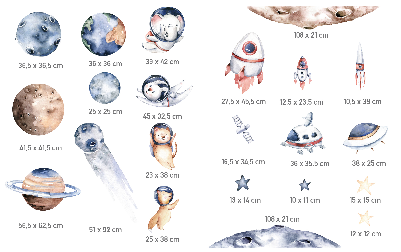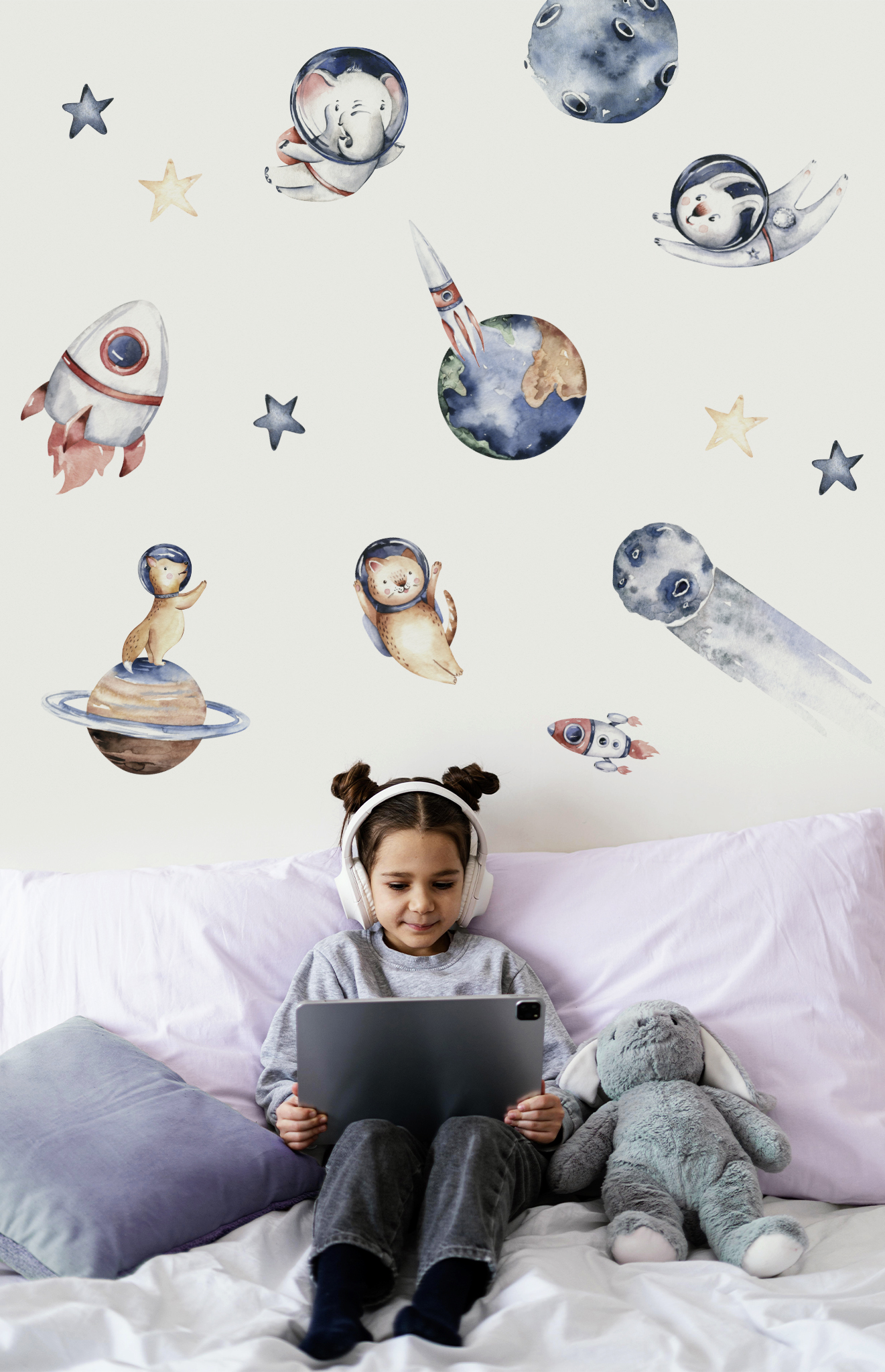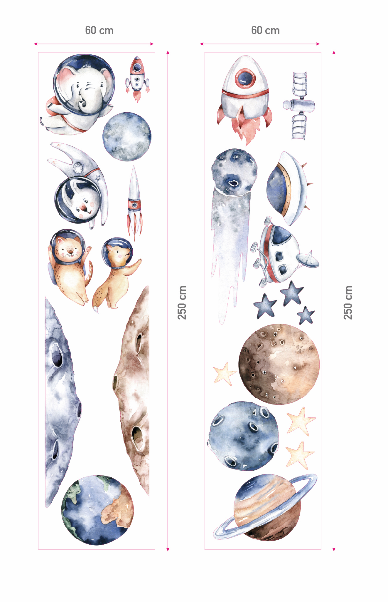 Transform your child’s room into a celestial universe with our space-themed wall stickers! This captivating setting takes little explorers among distant planets, twinkling stars and fearless astronaut animals, such as a cosmonaut cat or a weightless floating elephant.
