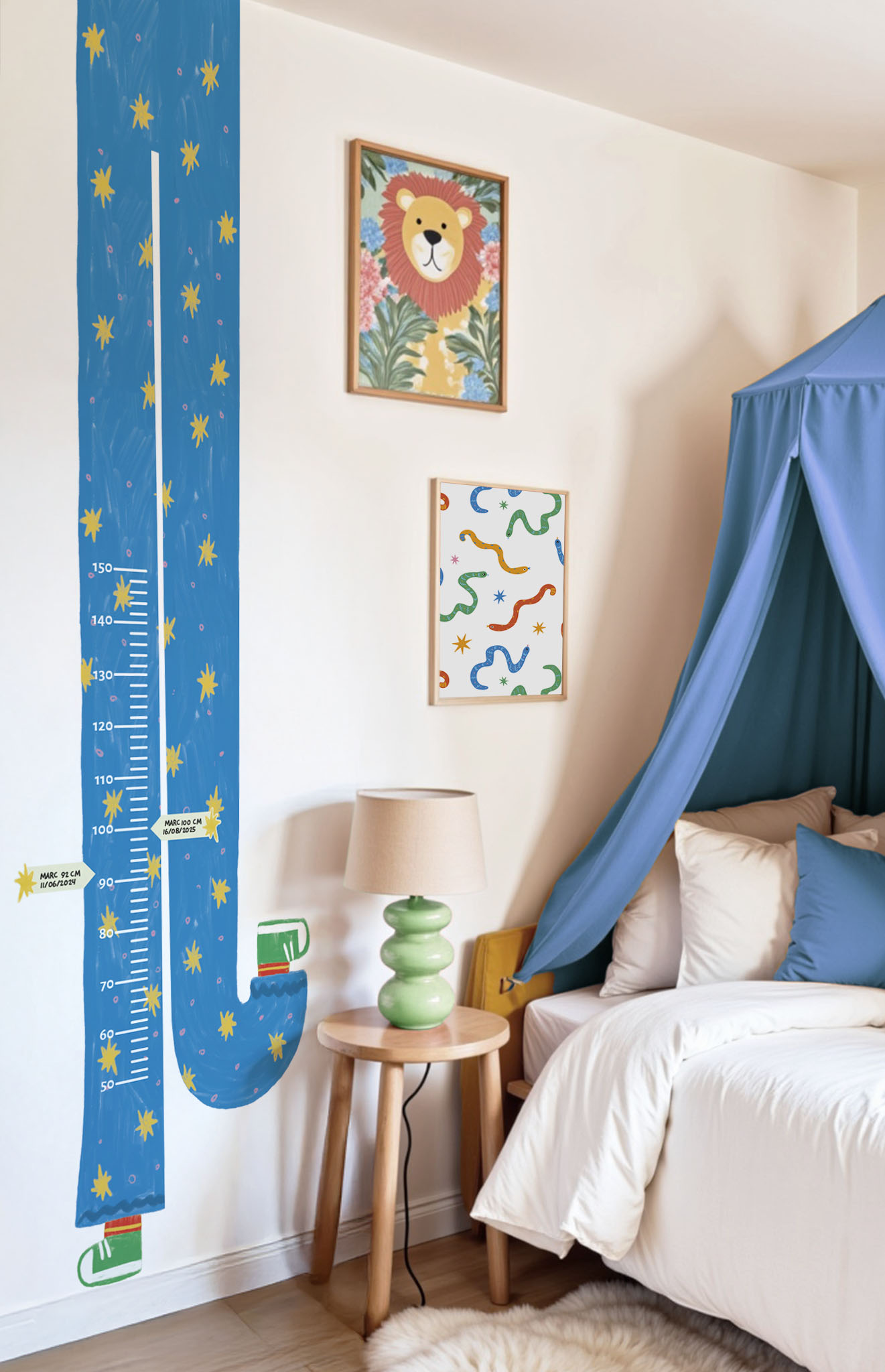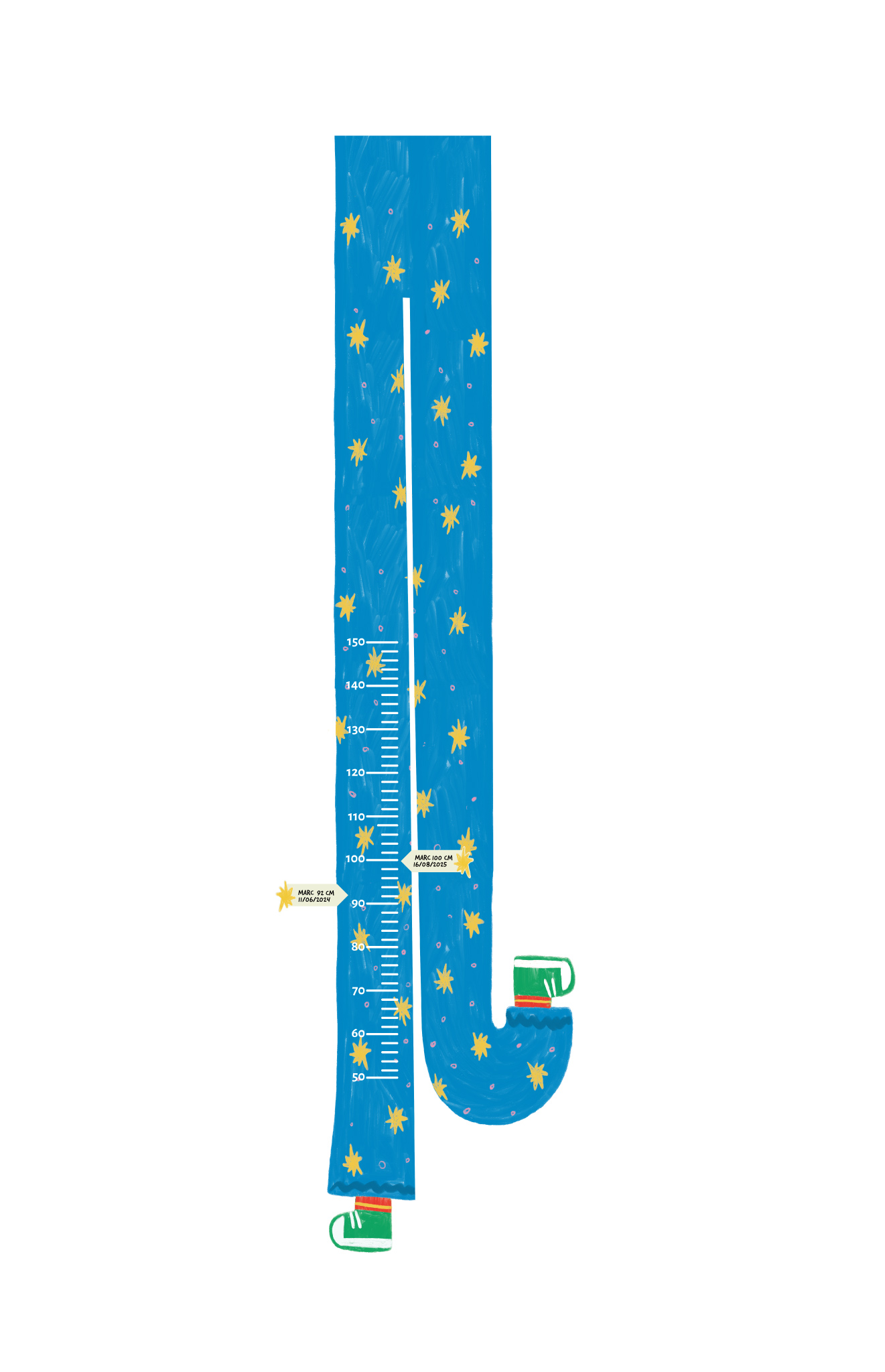 Forget the classic height charts! She arrives in funky mode with her long blue legs, her little sneakers and her starry look that blows the eyes. Stuck to the wall, it makes a splash in a child’s room or playroom, while following the growth of your little ones with humor and good humor.