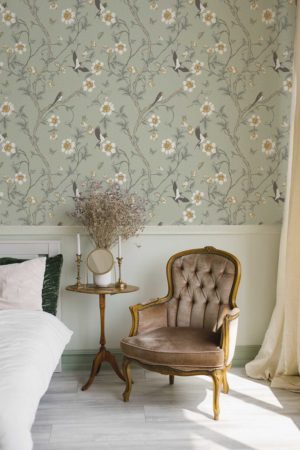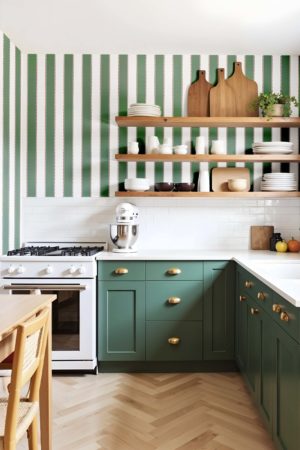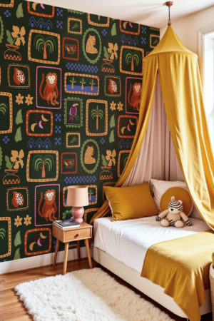Green is versatile: lighter tones brighten small spaces, while darker shades create cosy, dramatic vibes. Use them in bedrooms for relaxation, living rooms for sophistication, or bathrooms for a spa-inspired sanctuary. Pair leafy botanicals with minimal furniture for a natural look, or go bold with geometric green patterns for a modern statement wall.