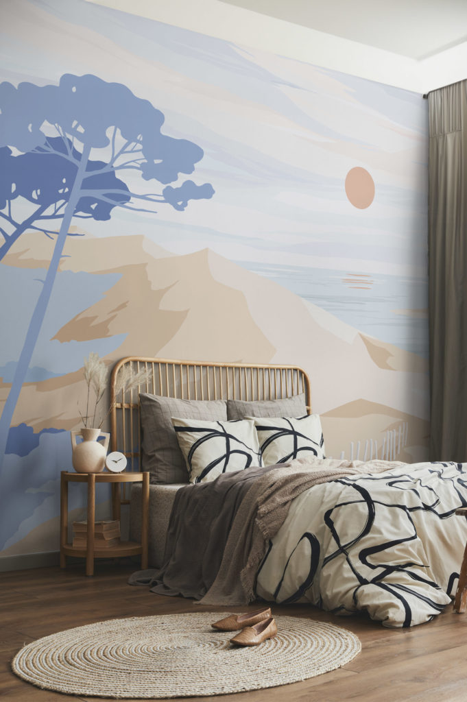 Desde selvas tropicales hasta bosques nórdicos nevados, los murales panorámicos son una forma de abrir visualmente el espacio. Se usan mucho en comedores o detrás de la cama.