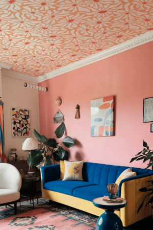 Le choix d’un papier peint pour plafond dépend de l’ambiance que vous souhaitez créer. Optez pour des couleurs claires et des motifs discrets pour agrandir visuellement une pièce, ou osez les teintes foncées pour un effet cocooning. Nos collections s’adaptent aux salons, chambres, salles à manger, et même aux espaces de travail.