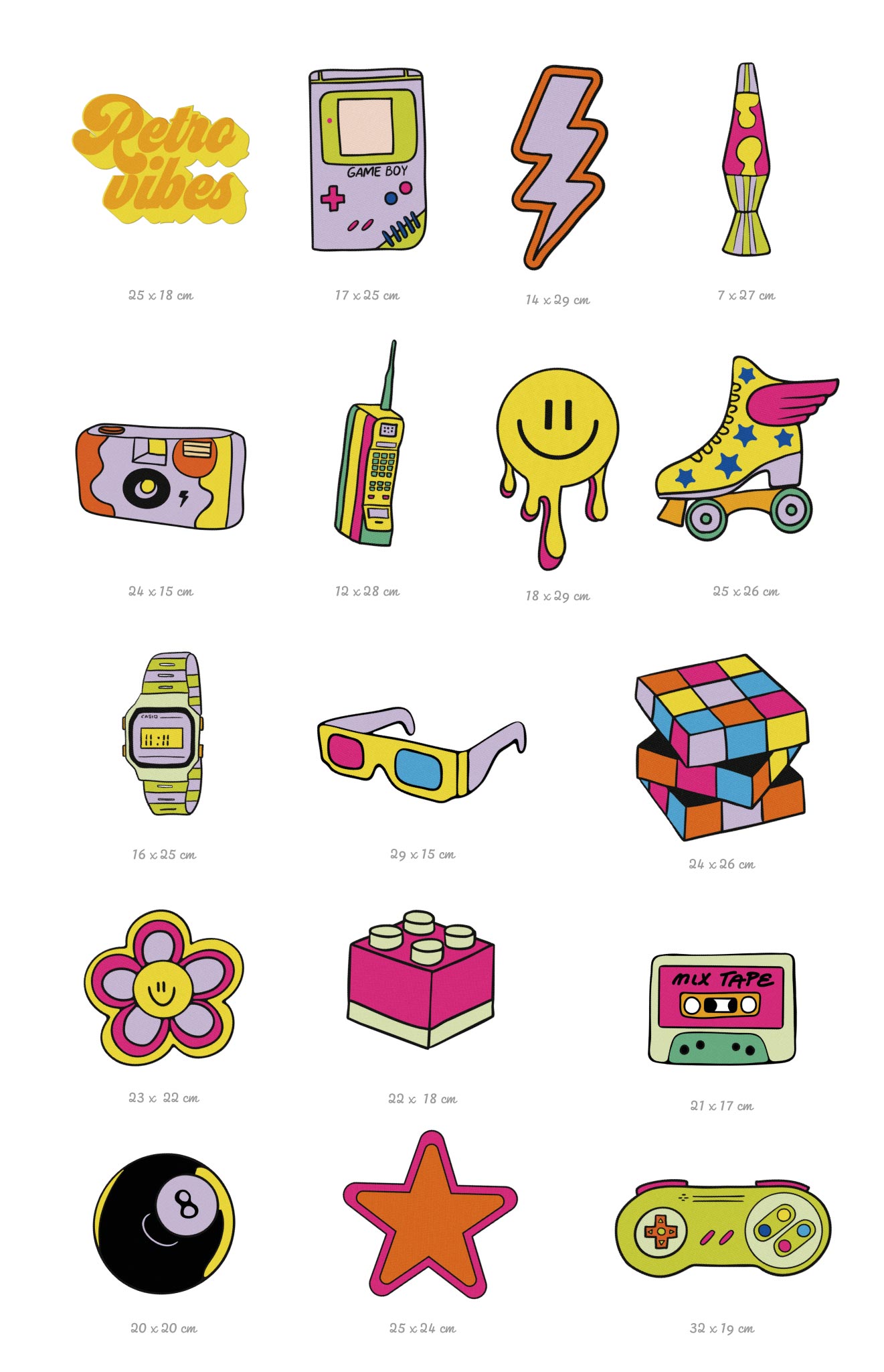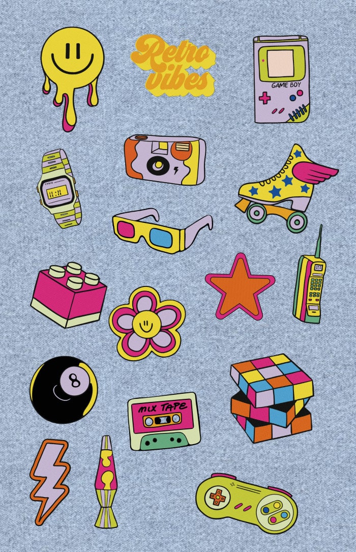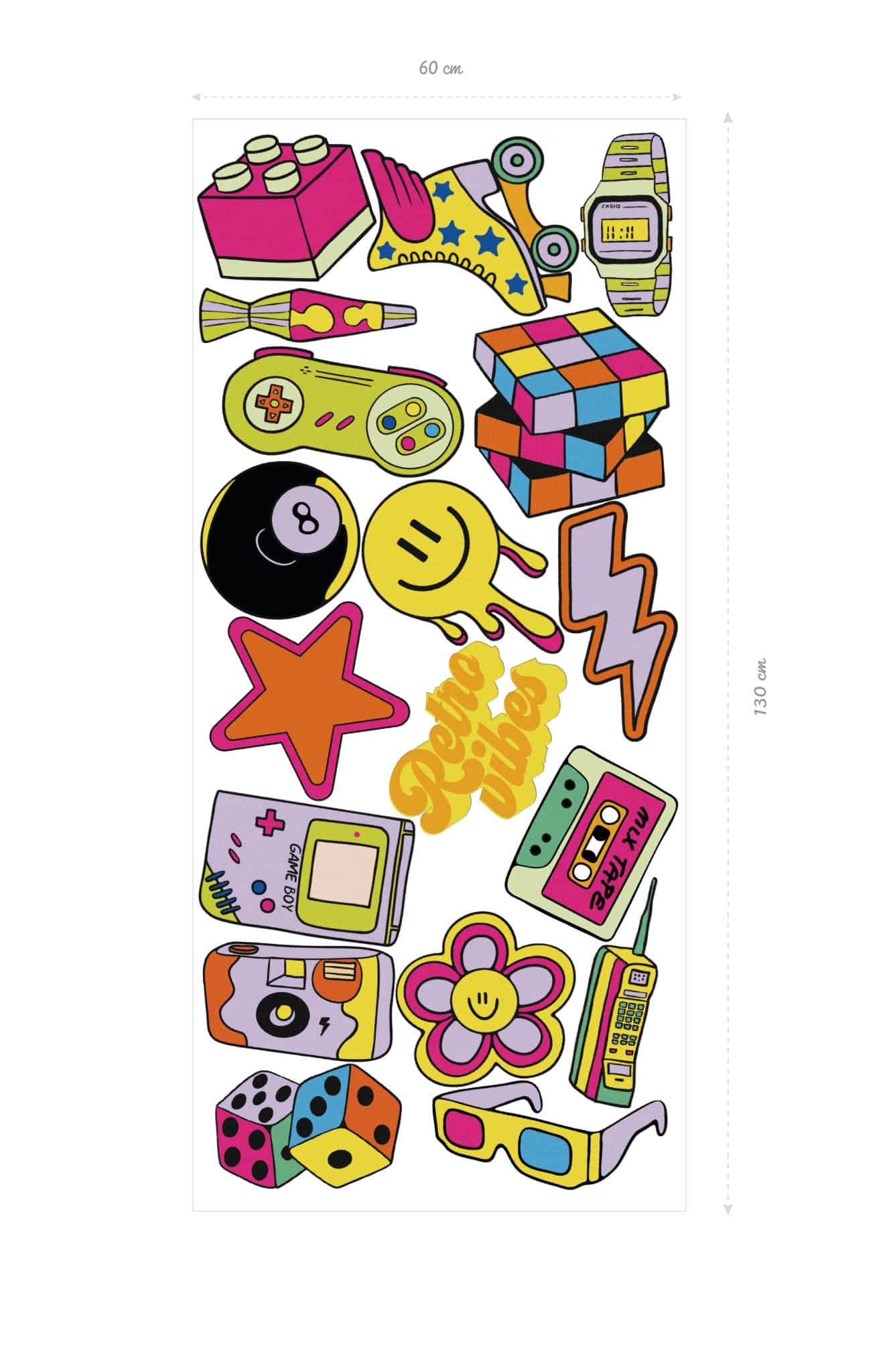Ambiance nostalgie garantie ! Game Boy, rollers ailés, lunettes 3D, fleurs smiley et mixtapes… Ces stickers rétro pop transforment ton mur en machine à remonter le temps. Fun, flashy et totalement feel-good : la déco parfaite pour réveiller ton âme des années 90.