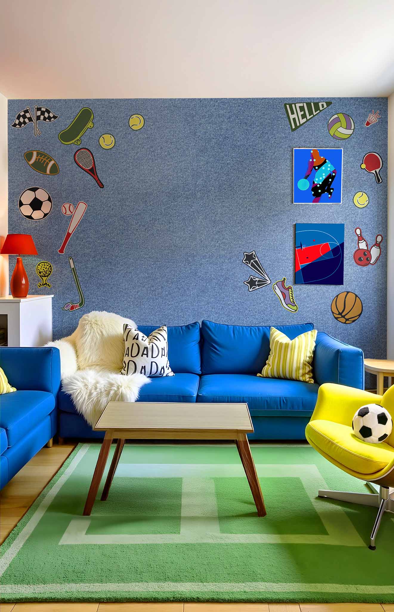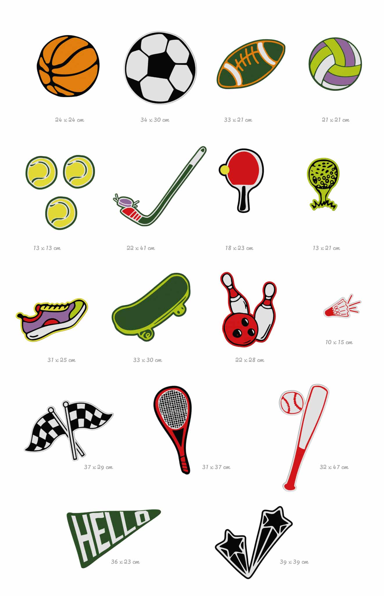 Le pack de stickers muraux Game On! est une invitation à créer une décoration dynamique et ludique autour de l’univers du sport. Basketball, football, tennis, skateboard, bowling, baseball, golf ou encore badminton : ce pack réunit une grande variété de sports illustrés dans un style graphique moderne et coloré.