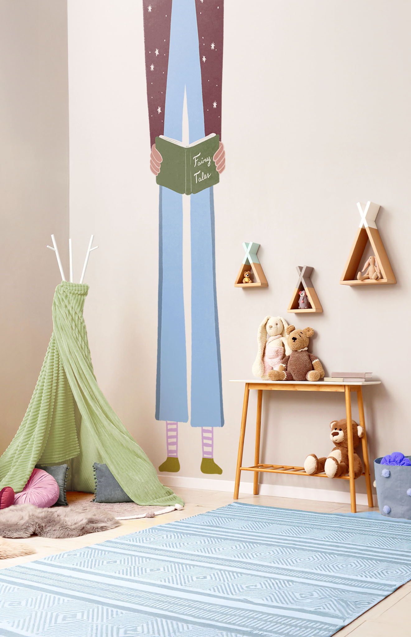 Les jambes dans les étoiles, les mains accrochées à un conte, ce sticker XXL transforme un mur en scène imaginaire. Il invite au calme, à la lecture, aux histoires du soir et aux mondes qu’on invente avant de dormir.